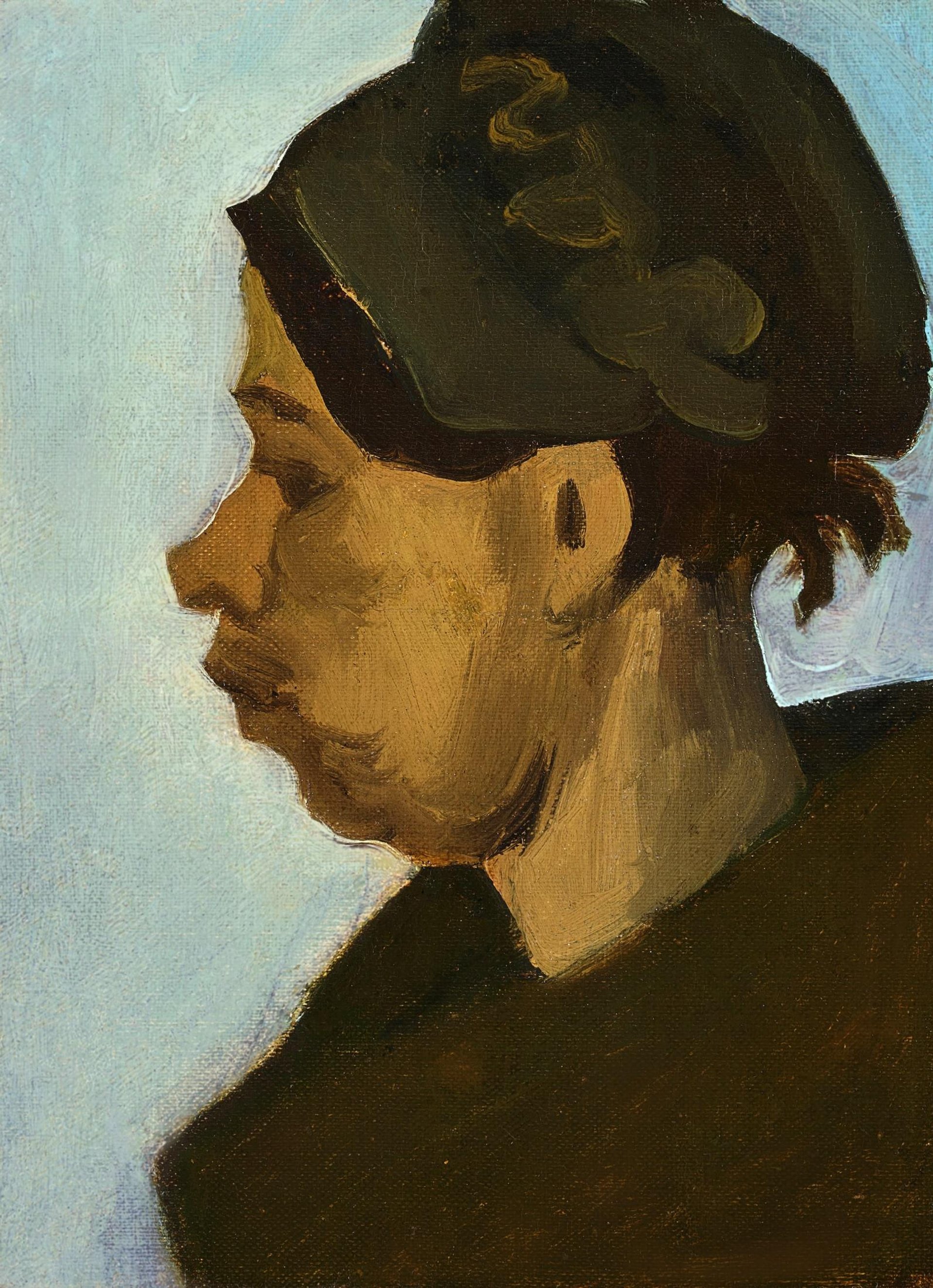 Head of a Peasant is a profile of a woman from Nuenen, the village where Vincent’s parents lived. In the first half of 1885 he made more than 30 paintings of women, most of which have a dark background, although in this example the sitter is shown against blue-green.