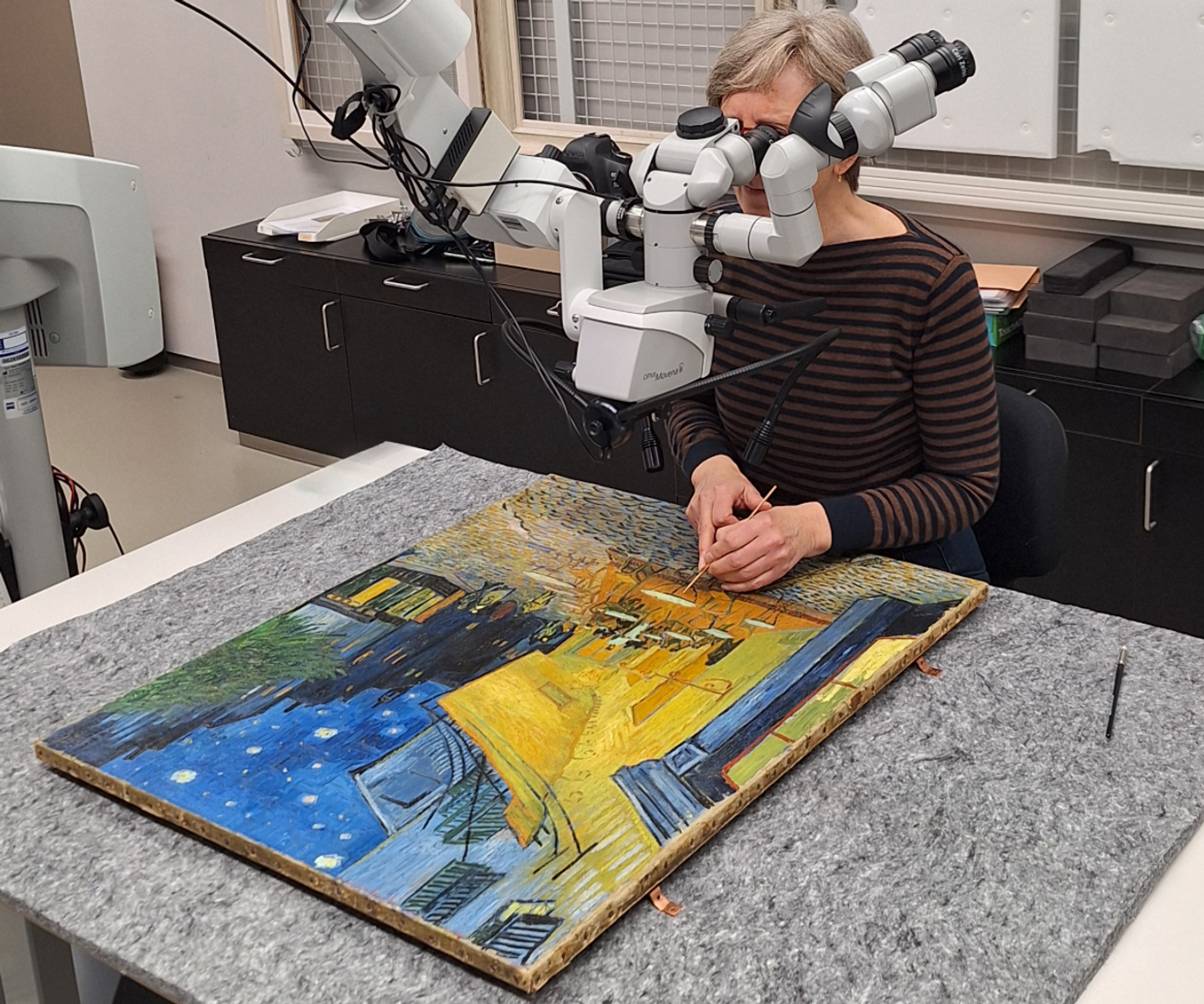 Conservator Madeleine Bisschoff examining Van Gogh’s Terrace of a Café at Night (September 1888)