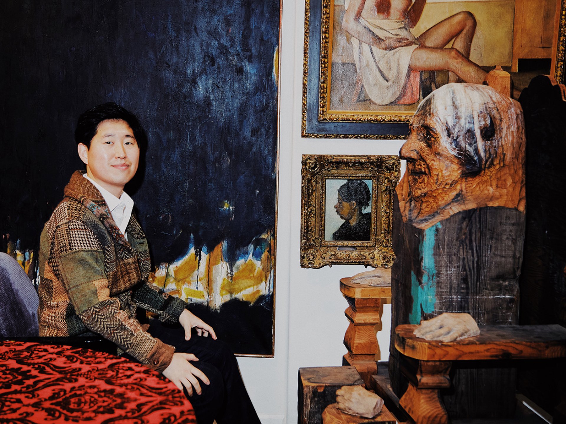 Shin with Van Gogh’s Head of a Peasant in his New York apartment, hanging beside some of his eclectic collection—with paintings by Sam Francis and Balthus and a sculpture by Marisol Escobar