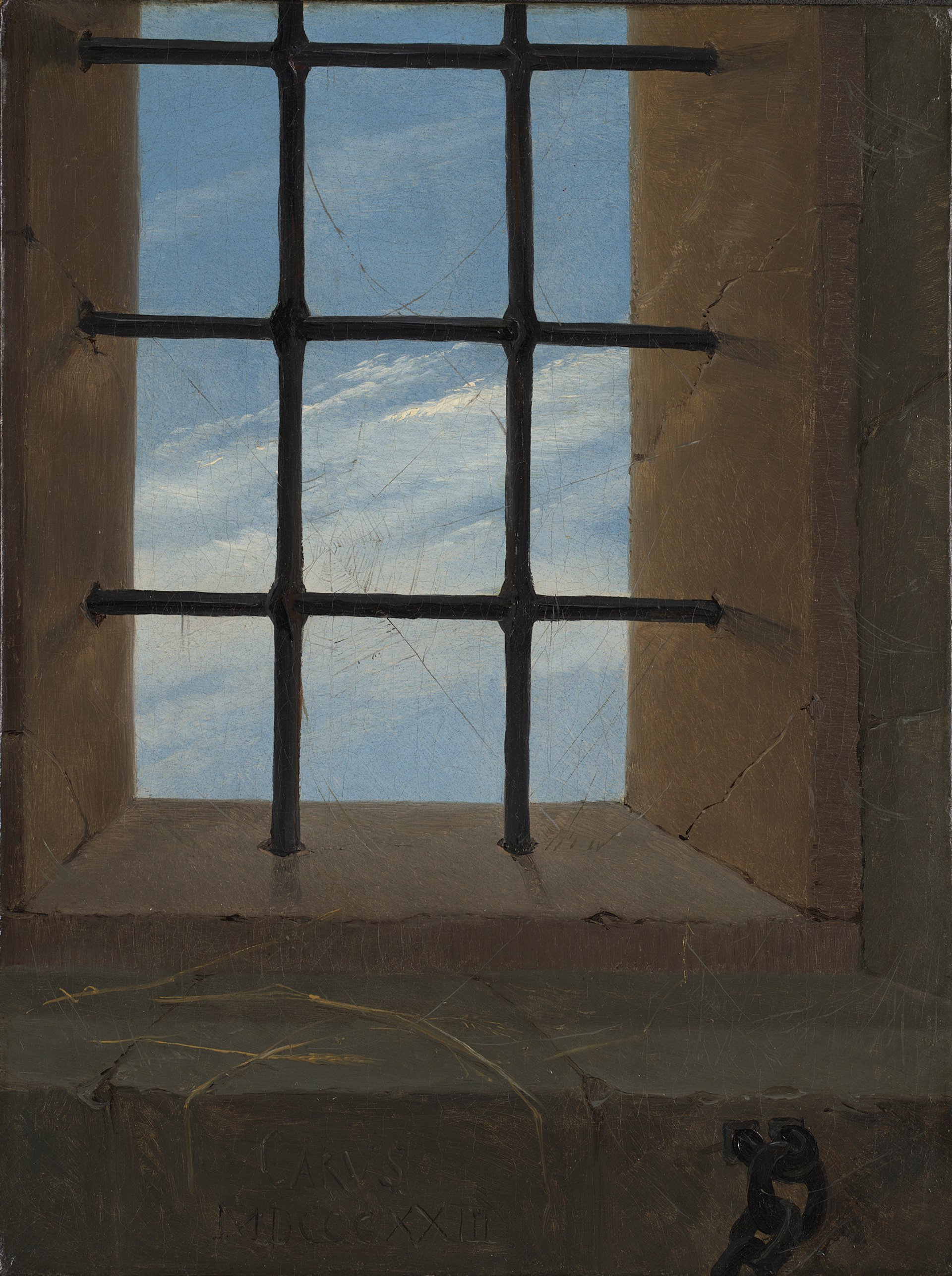 “This small, arresting work was painted in Dresden at the height of Carus’s friendship with [the German Romantic painter] Caspar David Friedrich (1774–1840,” the National Gallery says. “The view looks out through a barred window onto a blue sky streaked with wisps of white cloud, with no features of town of country visible.”
