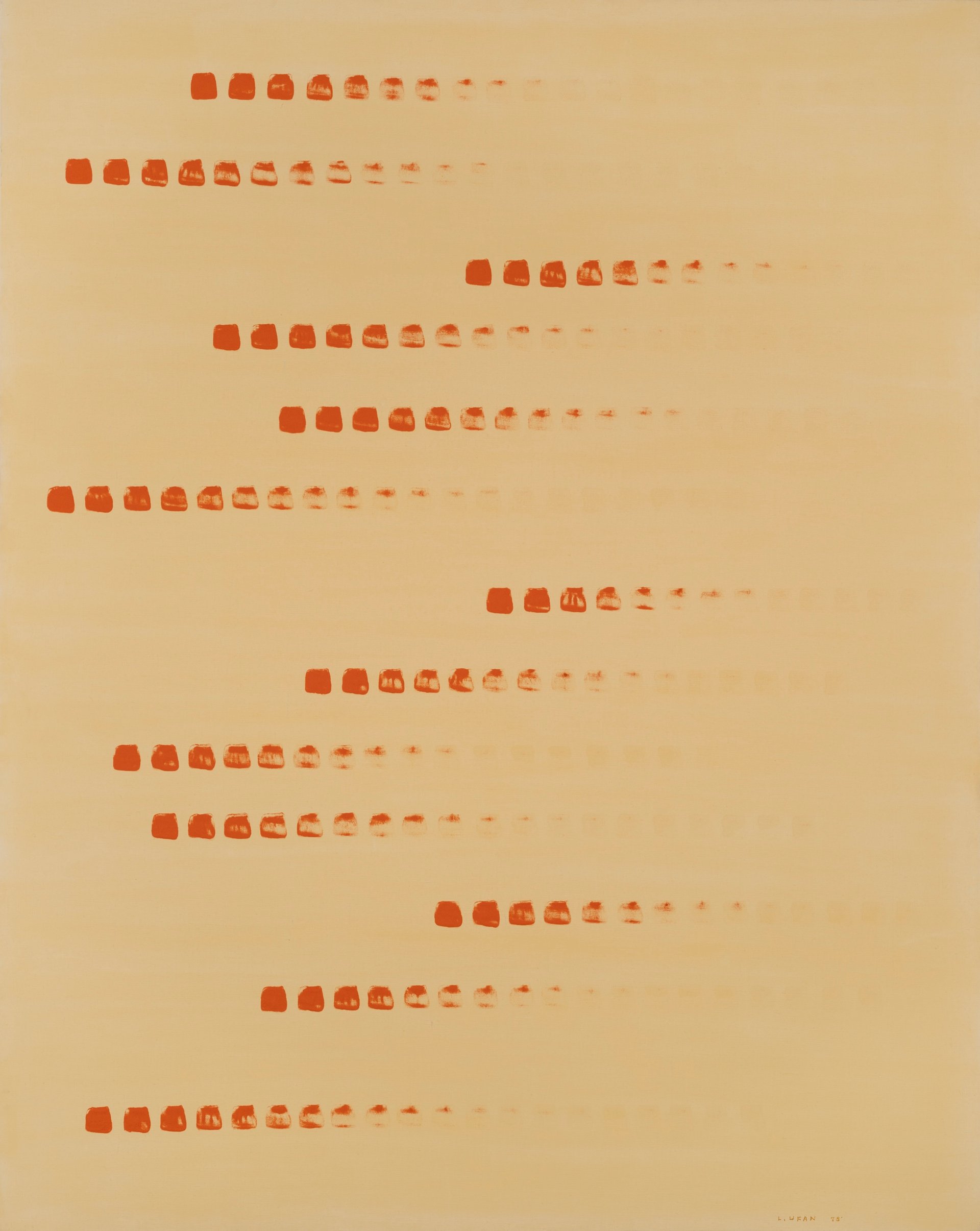 Works in the artist’s From Point and From Line series record the passage time through the repeated application of mineral pigments, with dots and strokes, respectively, gradually becoming more faint. The With Winds works, meanwhile, which feature minimal brushstrokes in geometric configurations, date from the early 1990s, when Lee returned to painting after a prolonged engagement with installation art.