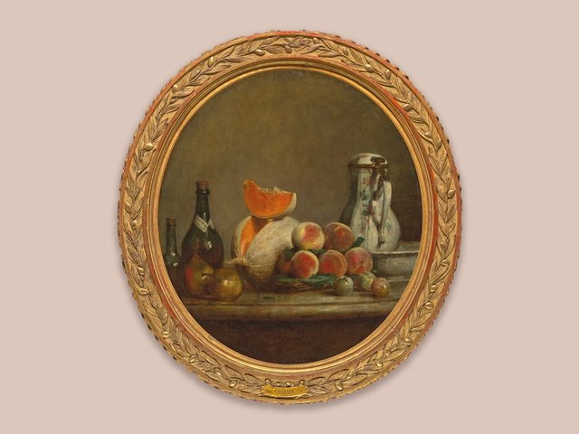 The Cut Melon, which has kept its original frame since its exhibition at the Royal Academy’s Salon in 1761, comes from legendary collections. It formed a pair with a painting of a jar of apricots in brandy, acquired by the Art Gallery of Ontario in Toronto in 1962. Both compositions share a rare oval shape. The pair was purchased by King Louis XV’s goldsmith Jacques Roëttiers, before joining the collection founded by François Martial Marcille, an early admirer of Chardin. It was bought at Drouot from the Marcilles’ inheritance in 1876 by Charlotte de Rothschild, the widow of baron Nathaniel de Rothschild. Both still lifes stayed in the family until their sale.