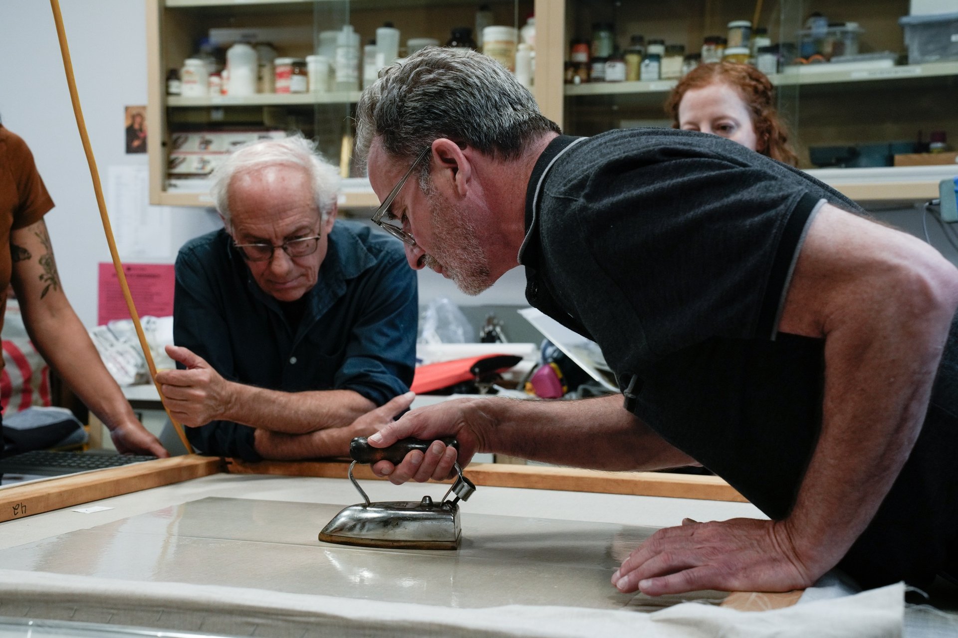 The conservators Dean Yoder and Matteo Rossi Doria demonstrate canvas lining using the new Beva 371 Akron formulation at the Conservation Center at NYU’s Institute of Fine Arts Photo: Nita L. Roberts