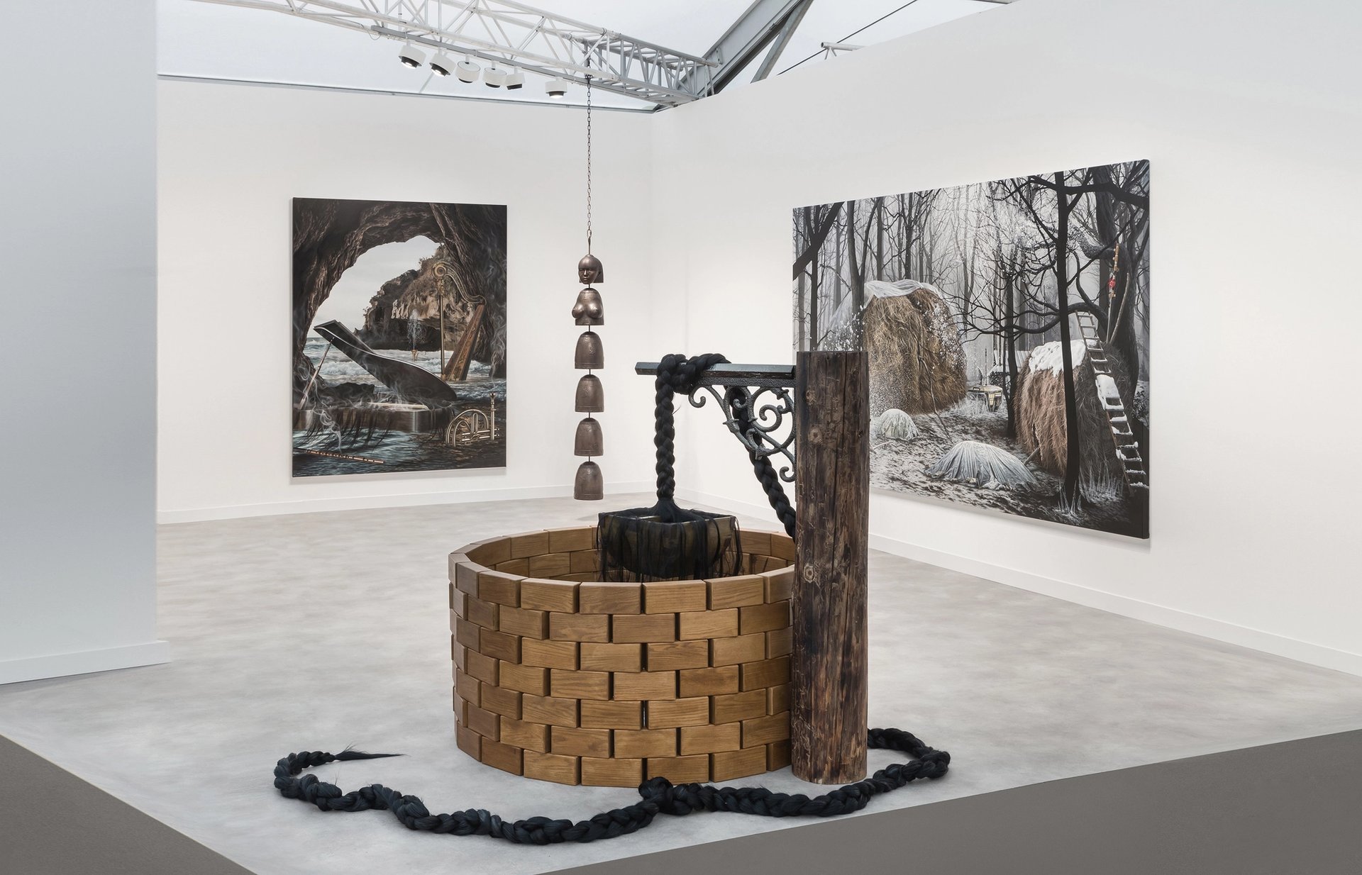 Sun’s sculpture Portal (2024), which incorporates synthetic hair and a vintage Korean bucket