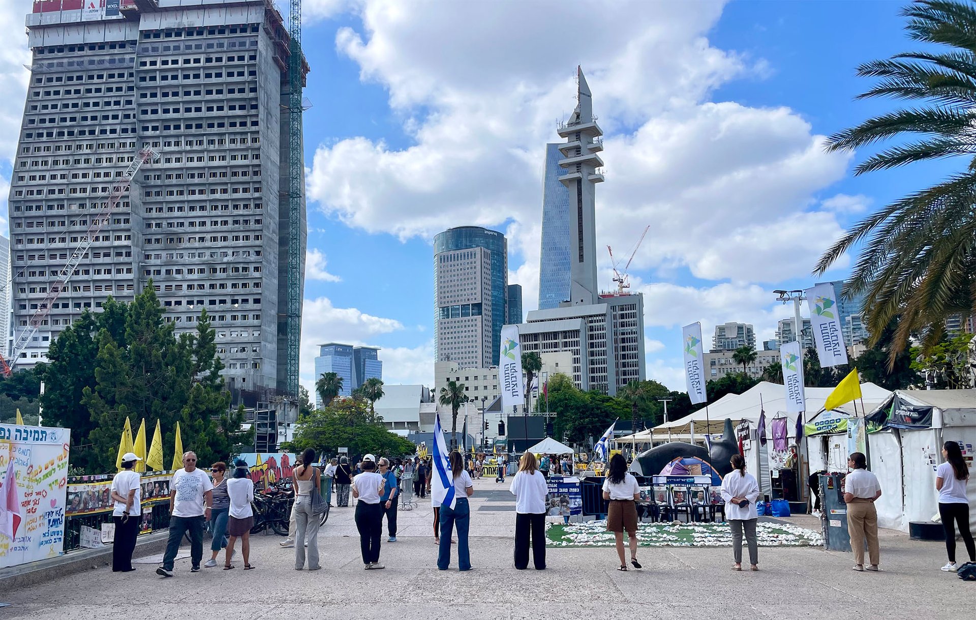 Tel Aviv Museum of Art workers face Hostages Square during their daily protest outside the museum Photo © Karen Chernick