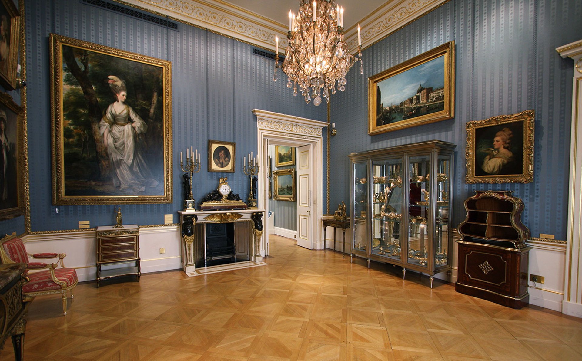 The West Room of Hertford House, demonstrates the Wallace Collection's completeness, including examples of 18th-century furniture of the highest quality and the great Augsburg silver-gilt toilet service (1767-73, in the cabinet right), as well as paintings by Joshua Reynolds and George Romney. The view of The Grand Canal with San Simeone Piccolo (around 1737), above the Augsburg cabinet, was for long attributed to Canaletto. It was recently reattributed to his nephew and pupil Bernardo Bellotto. The painting now hangs in West Gallery I, with a large collection of works by Canaletto and Francesco Guardi Courtesy: Wallace Collection