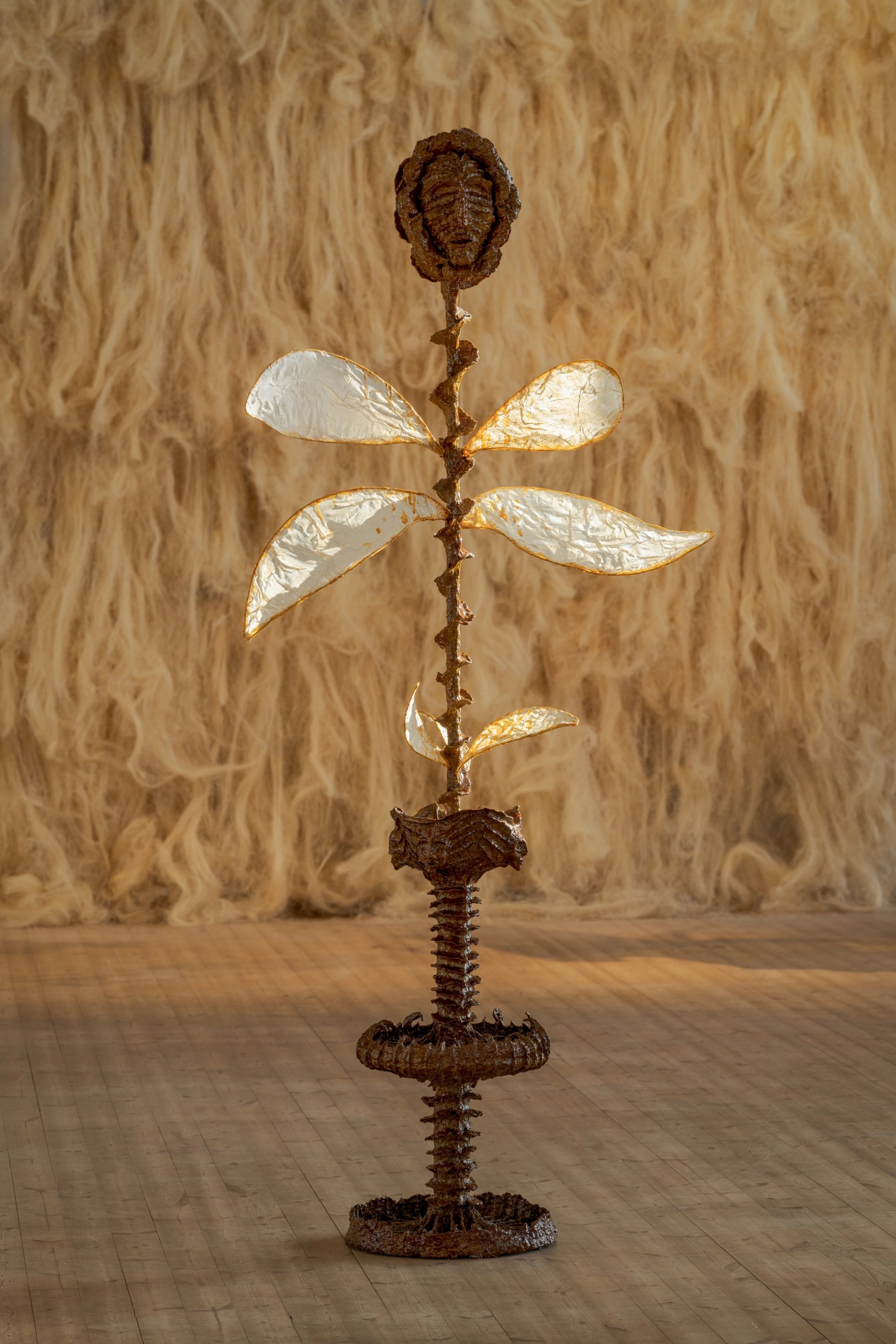 Born in Mauritius, which was once home to the famously extinct dodo, Bayjoo’s exhibition is in part a memorial to the many lost species of the Indian Ocean islands that perished as a result of colonial occupation and now only exist in drawings or the greenhouses of botanical gardens. During a recent residency in Thailand, Bayjoo worked with a foundry specialising in statues for temples and using these traditional techniques he reverently casts many of these vanished plants, drawing attention to the plant as well as the human life devastated by colonialism. These lost ecosystems are also depicted in vivid paintings that are further complicated by being draped with white crochet cotton French Lace, a genteel but loaded textile synonymous with plantation slavery and the catastrophic plundering it supported.
