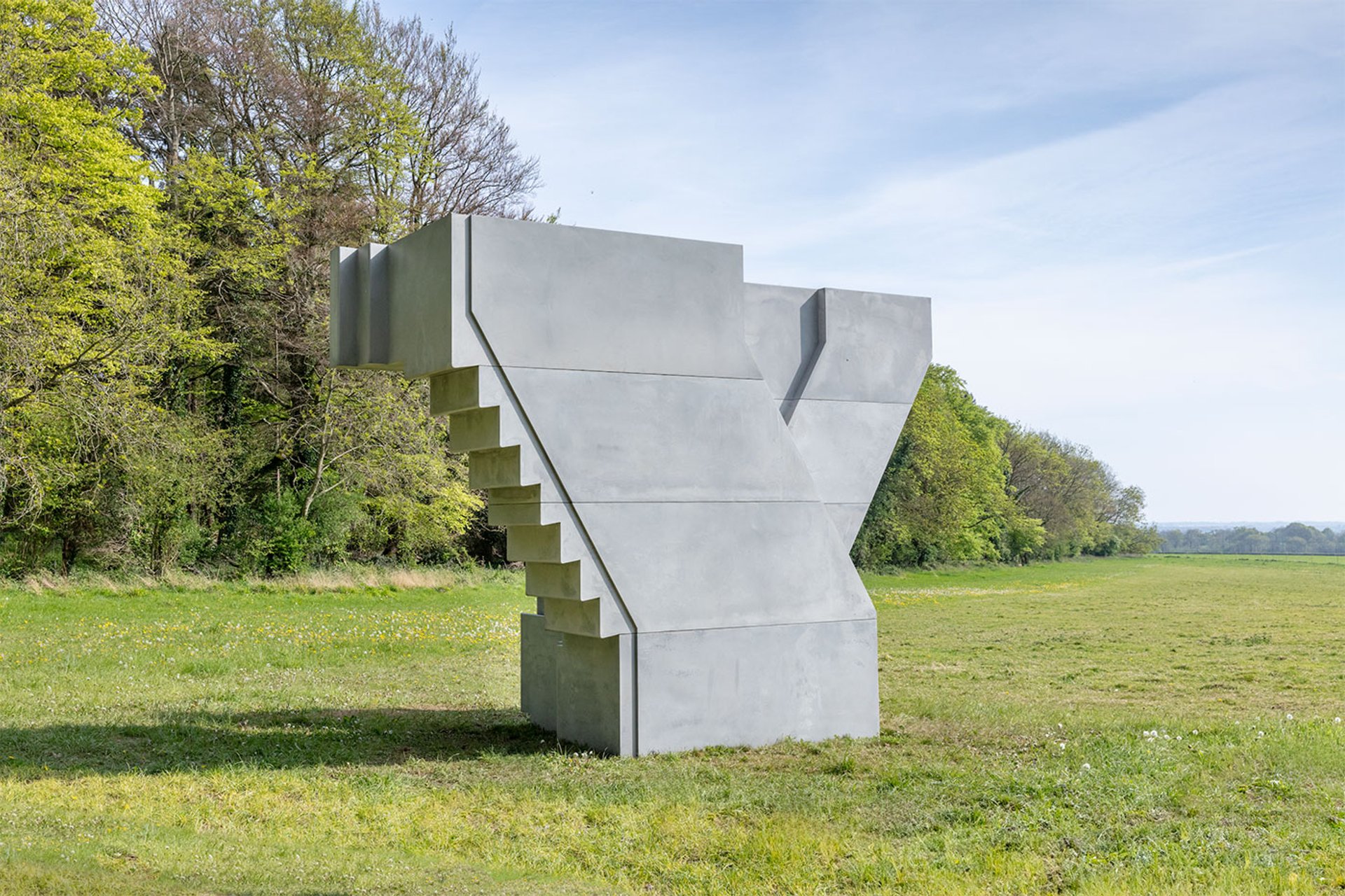 Looking south from the expansive cantilevered terrace of the 24 café, Whiteread’s Down and Up (2024-25)—a striking new work in blue-grey concrete representing a cast of a two-flight staircase—can just be made out at the near, top, end of the meadow, largely concealed from this vantage point, at the artist's request, by the sap-green late spring foliage.