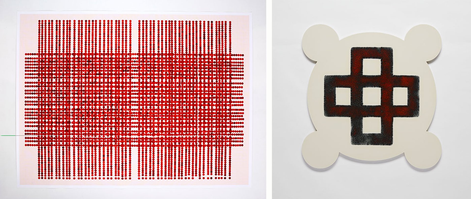 Two pieces by Lubna Chowdhary on show in the foundation's 24 café: Series 4: Number 2 (2022), left, and Marker 62 (2023) Courtesy of the artist and Jhaveri Contemporary