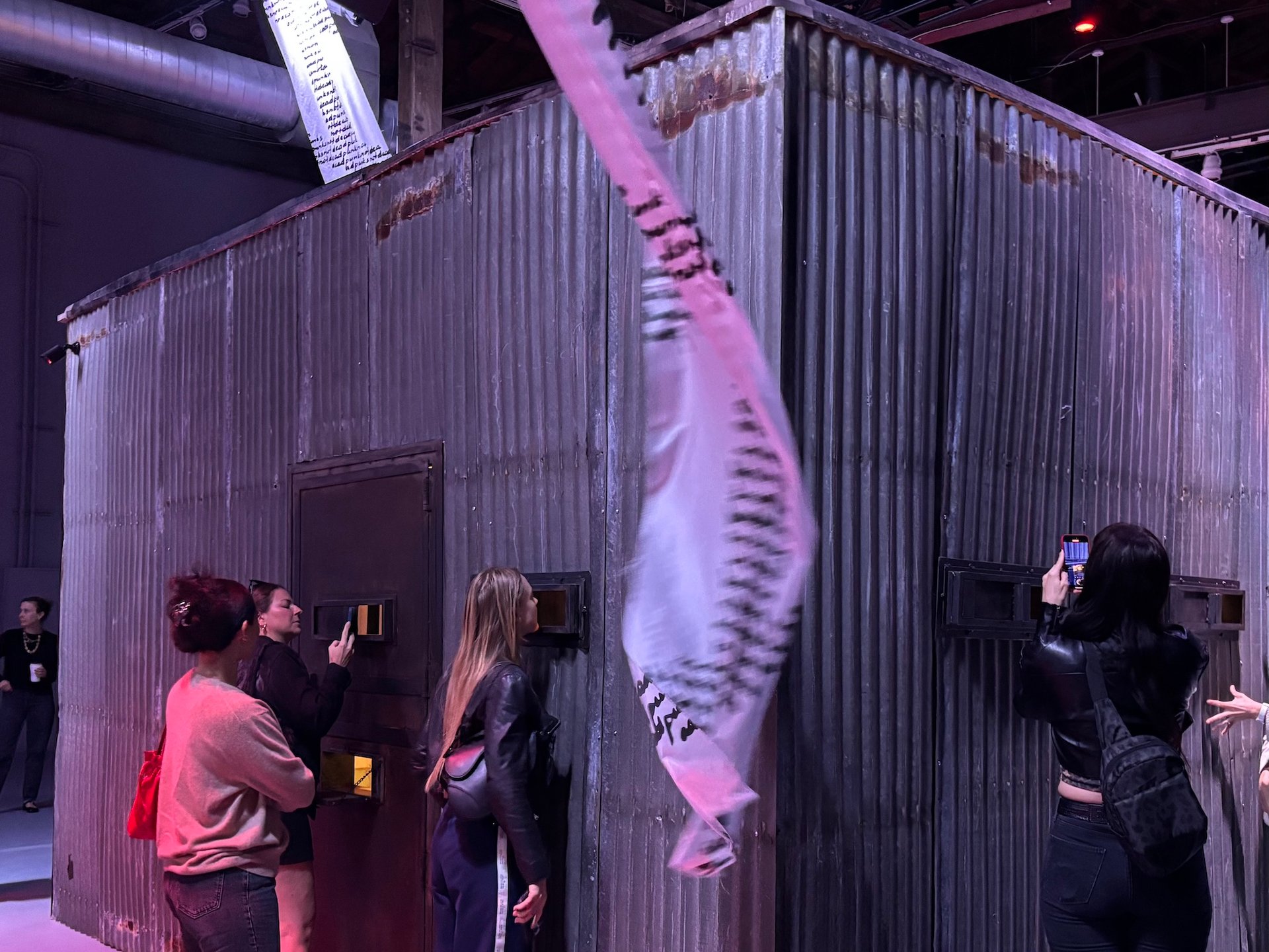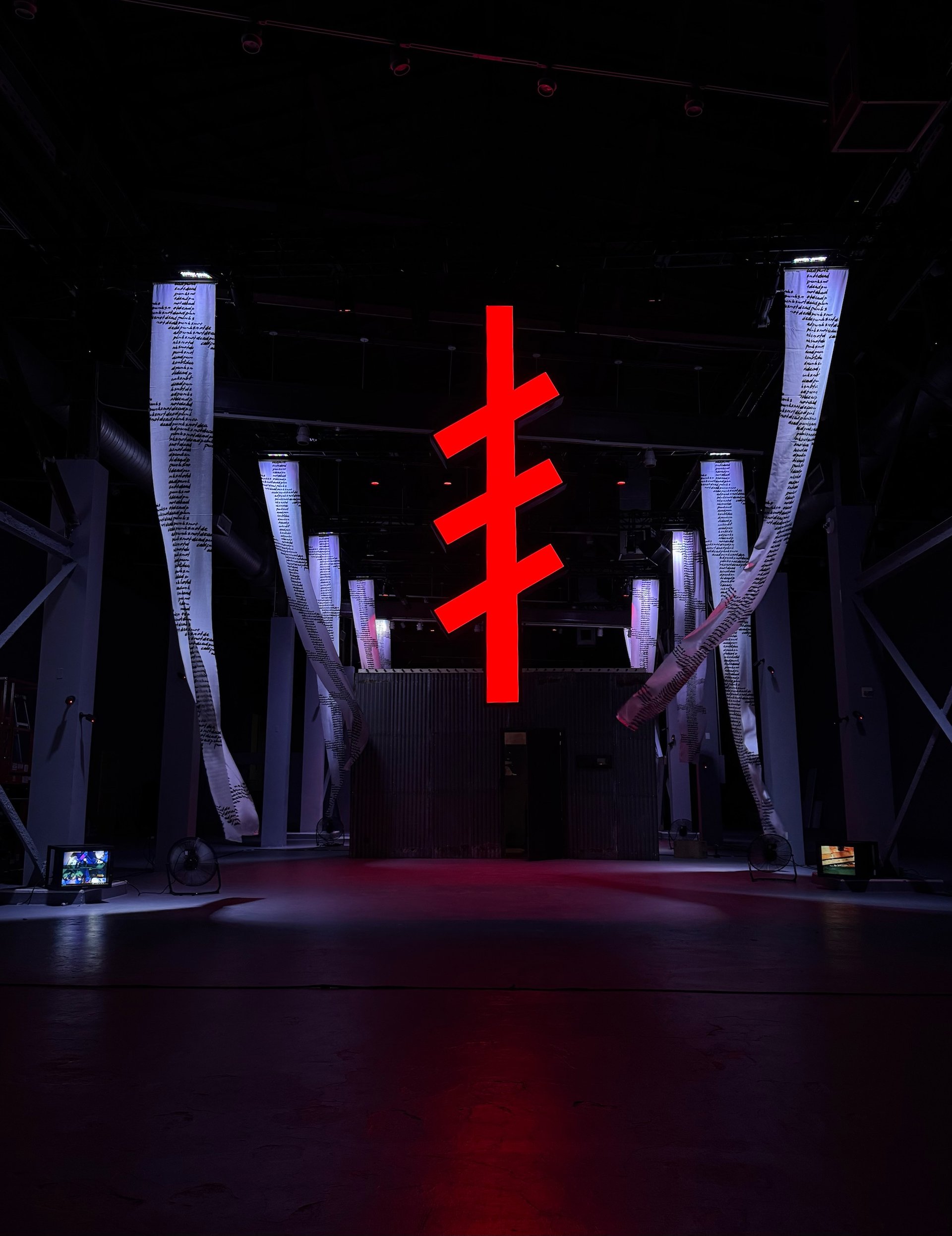 To see inside, some visitors kneeled on the floor to watch an old-school television with a four-channel surveillance feed. Several church pews nearby offered slightly more comfortable (also ritualistic) viewing of the scene at large. (The altarpiece, if you will, is a tall red neon sculpture featuring an icon of her own design—part Russian Orthodox cross, part jagged scar—that figures prominently in her recent work.)