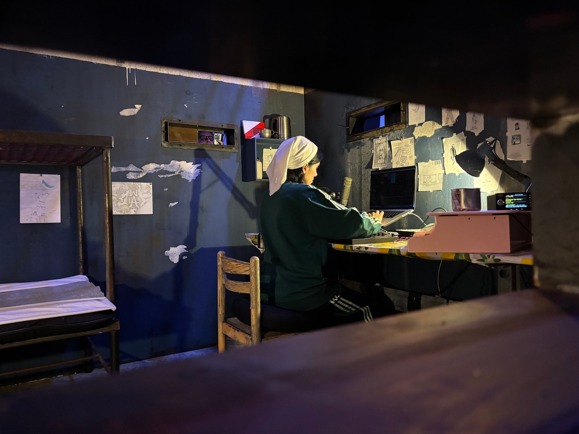 For the performance, which runs during museum hours until 15 June, the prominent activist-artist is creating a “soundscape” by layering music that she plays live with noise sampled from actual prisons and other tracks. She has to this end equipped her prison cell—the heart of a dark, moody installation at the museum’s Geffen location—with a pink toy piano, a synthesizer and laptop. She plans to release it all, around 80 hours worth of sound, as a single piece of very experimental music.
