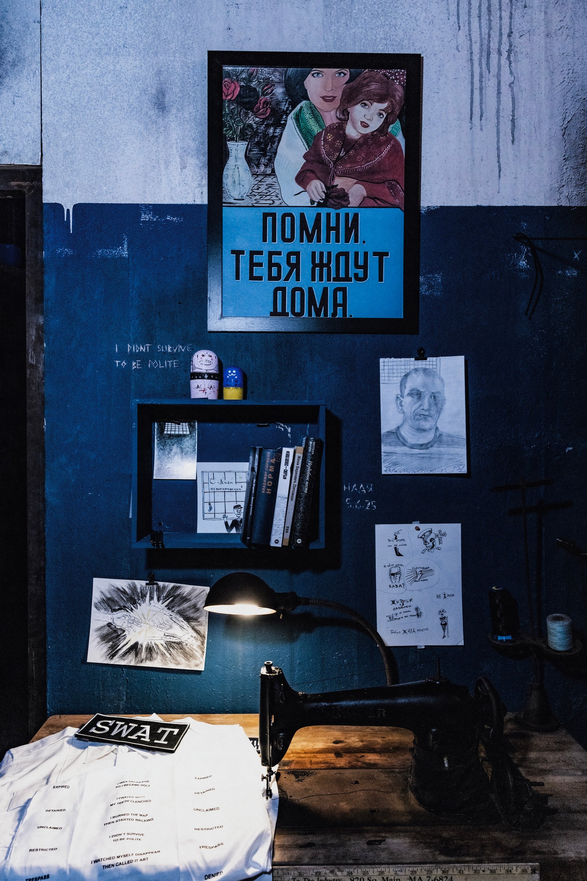 Other visitors pressed close to the steel cage of the prison cell, where large slits allow glimpses of Tolokonnikova, wearing an Adidas track suit in the same forest green as one of her former prison uniforms. Above her desk hang drawings that she commissioned from current Russian political prisoners. Visitors can also spot some graffiti, like a line scratched into the wall that says: “I didn’t survive to be polite.”
