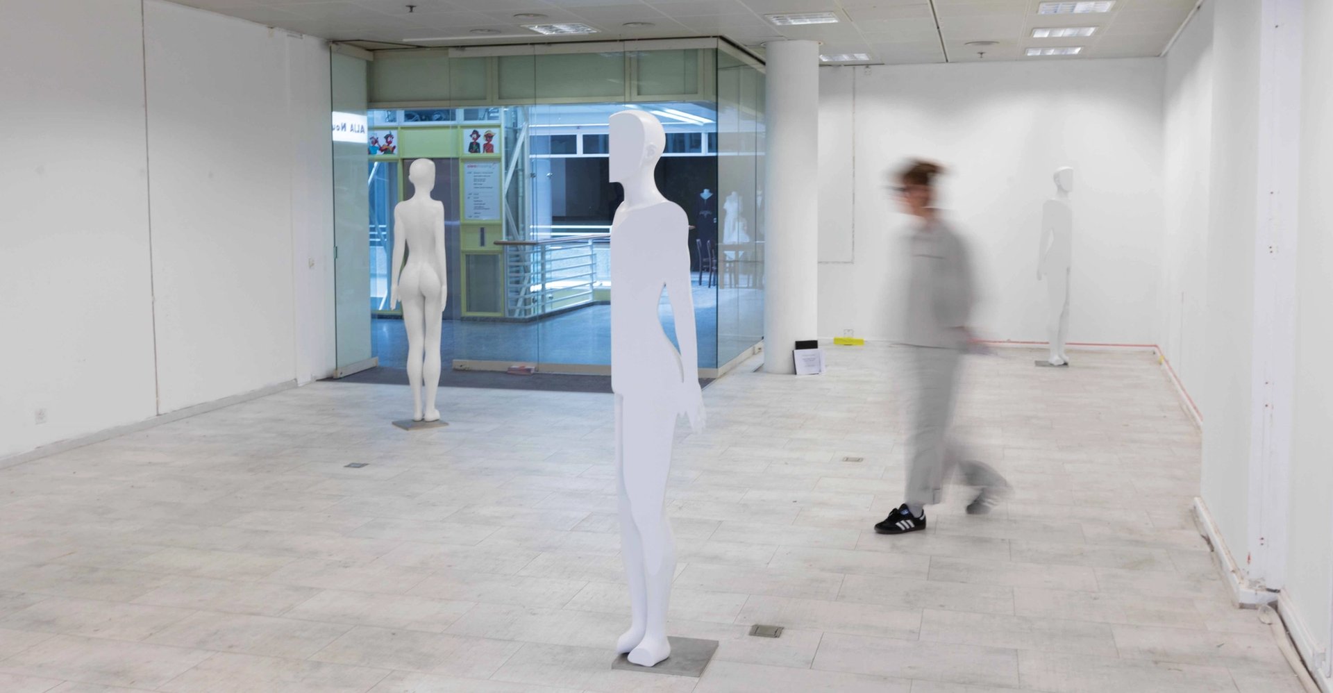 “Like Agnieszka Kurant (see above), Anna-Sophie Berger is fond of digital tools. She employs a process called “soft-body collision”, which is used in videogames to model how bodies react to external forces. Berger is interested in the violent effects of what she calls external modifiers, creating sculptures that look almost like shop mannequins—shown in an empty store in the Clara shopping centre.”