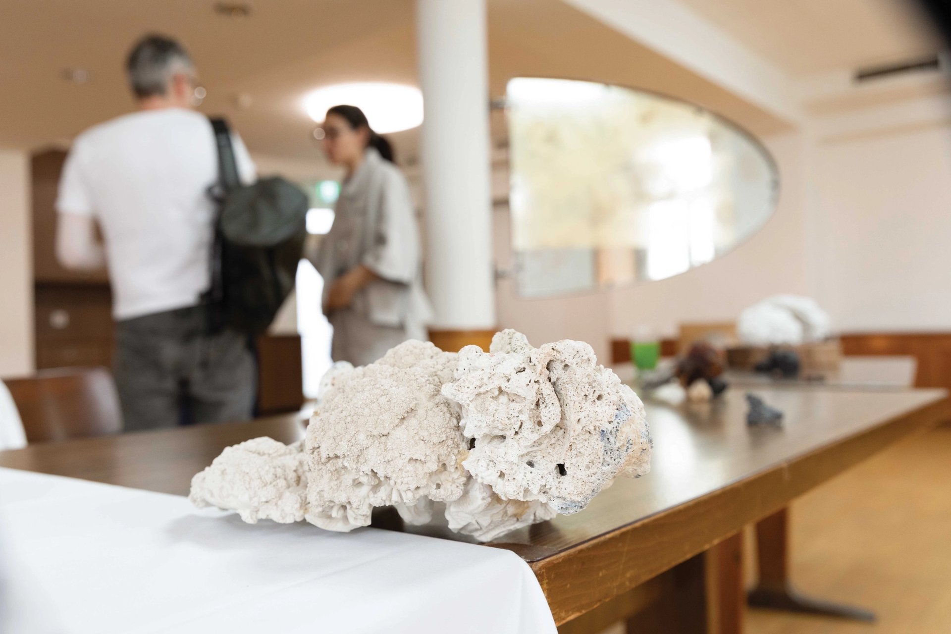 “Yu Ji has made a new site-responsive installation inside the banquet hall of the hotel. There are sculptures of concrete in the shape of organic forms such as cauliflowers, snails and other flora and fauna. She has used the existing furniture in the space—tables and chairs, for example—and sited her work around it. The artist is also collaborating with a local bakery, which will bake fresh bread every day to intersperse throughout the installation for people to taste, if they so wish.”