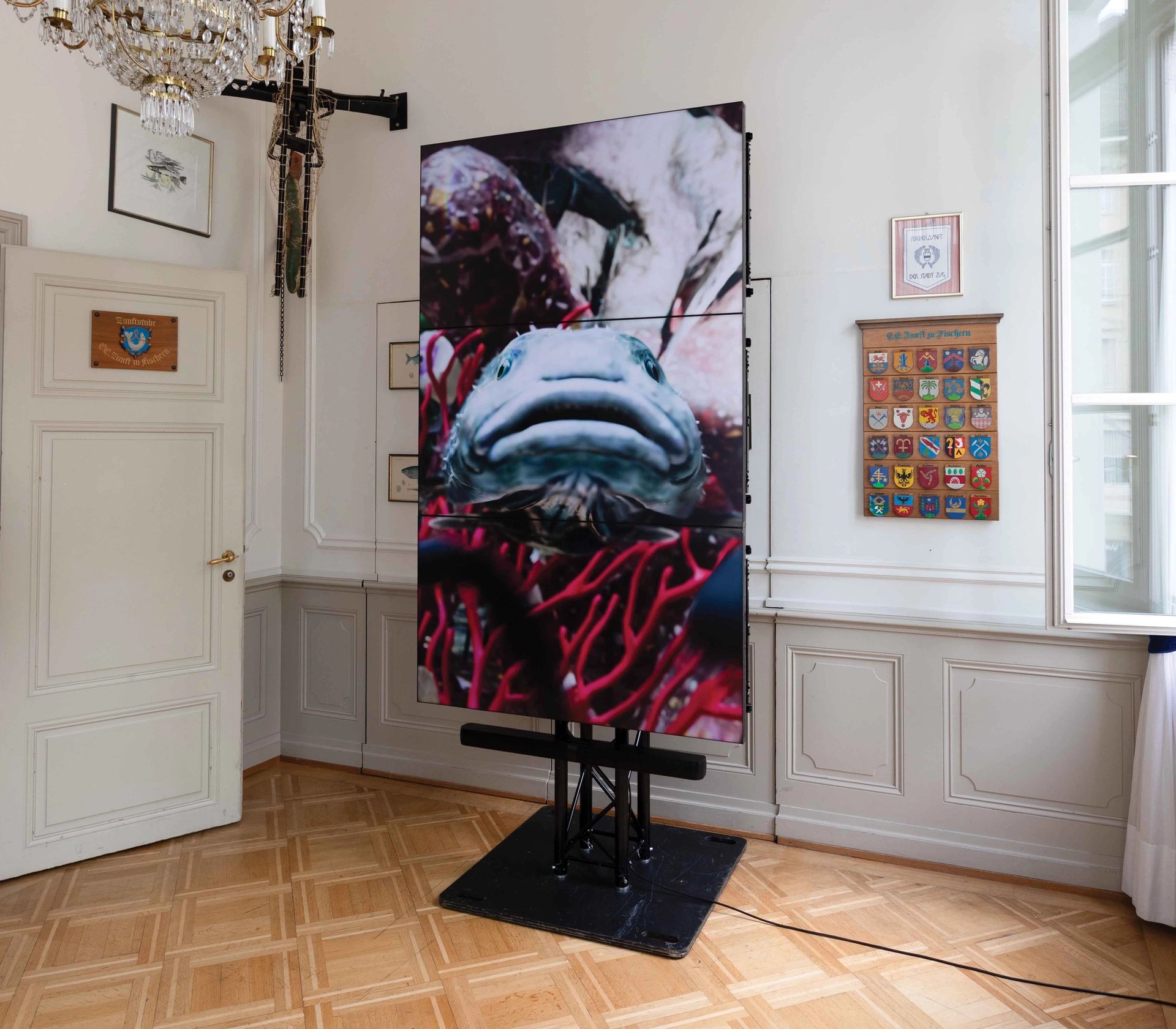 “Theo Triantafyllidis is a Greek artist who makes live simulations of underwater systems showing fish and marine life, and also plastic. One of these is is shown in the Merian hotel in the Fischerstube, which translates as fisherman’s room, where there are beautiful etchings of fish already on the walls.”