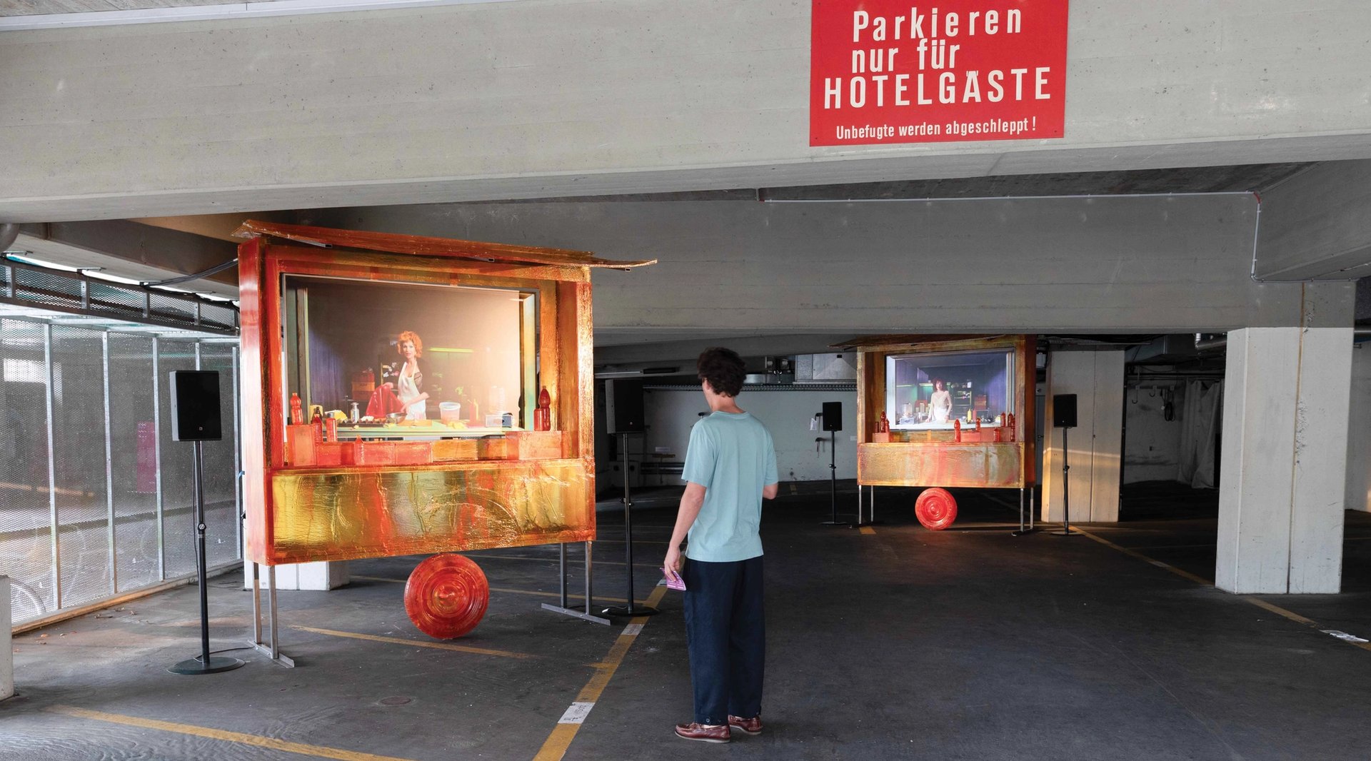 “In the garage underneath the Merian hotel, Marianna Simnett presents two sculptures in the shape of concession stands, like the ones at sporting events. They are made from a translucent orange-coloured resin. Inside them are videos of lonely women, who are singing melancholic songs to themselves. As they sing, every now and then, the shutters of the concession stands close and reopen.”