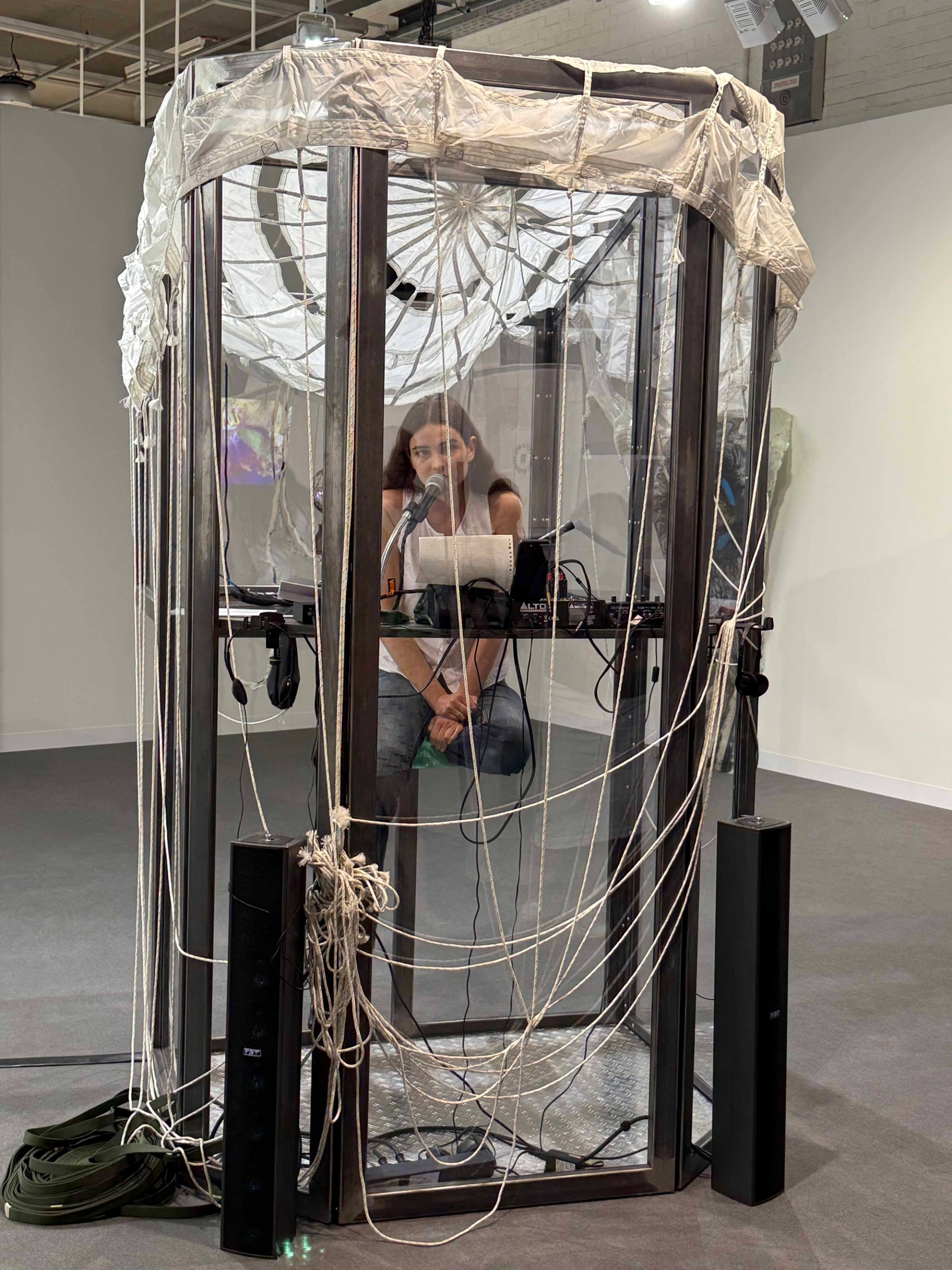 The German artist Mara Wohnhaas took centre stage at Art Basel yesterday with a performance evoking a staple of everyone’s childhood—the funfair. Wohnhaas is intrigued by the “barker”, who controls the rides and entertains the audience, occasionally playing music and dropping corny jokes. For Rekommandeur I (Barker I), she sits in the centre of a glass funfair booth with a parachute draped on top, reciting a poem that turns into a performance. “Excitement and inhibition, thrill and blockade—the tension of her practice rests on these opposing poles,” says her gallery, BQ, which is also offering fairgoers sweets, providing a sugar rush alongside the funfair thrills.