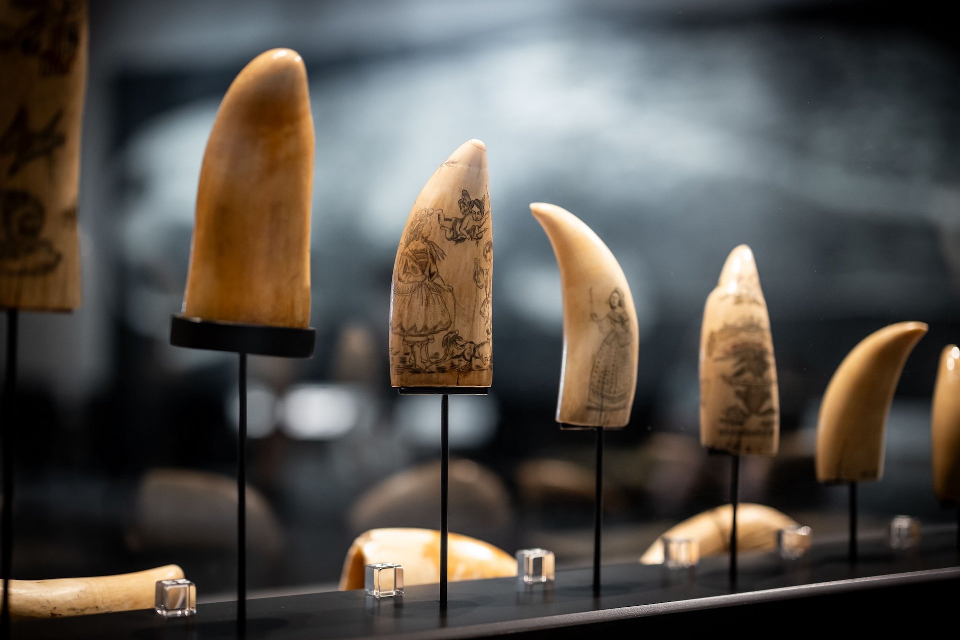 Although sailors are not often known for their artistic talents, some of the most beautiful objects on display in Monstrous are examples of scrimshaw—designs, scenes and even portraits intricately engraved into whale teeth by crewmembers in their free time onboard. Many of these depict scenes of whale hunting with a patriotic motif.