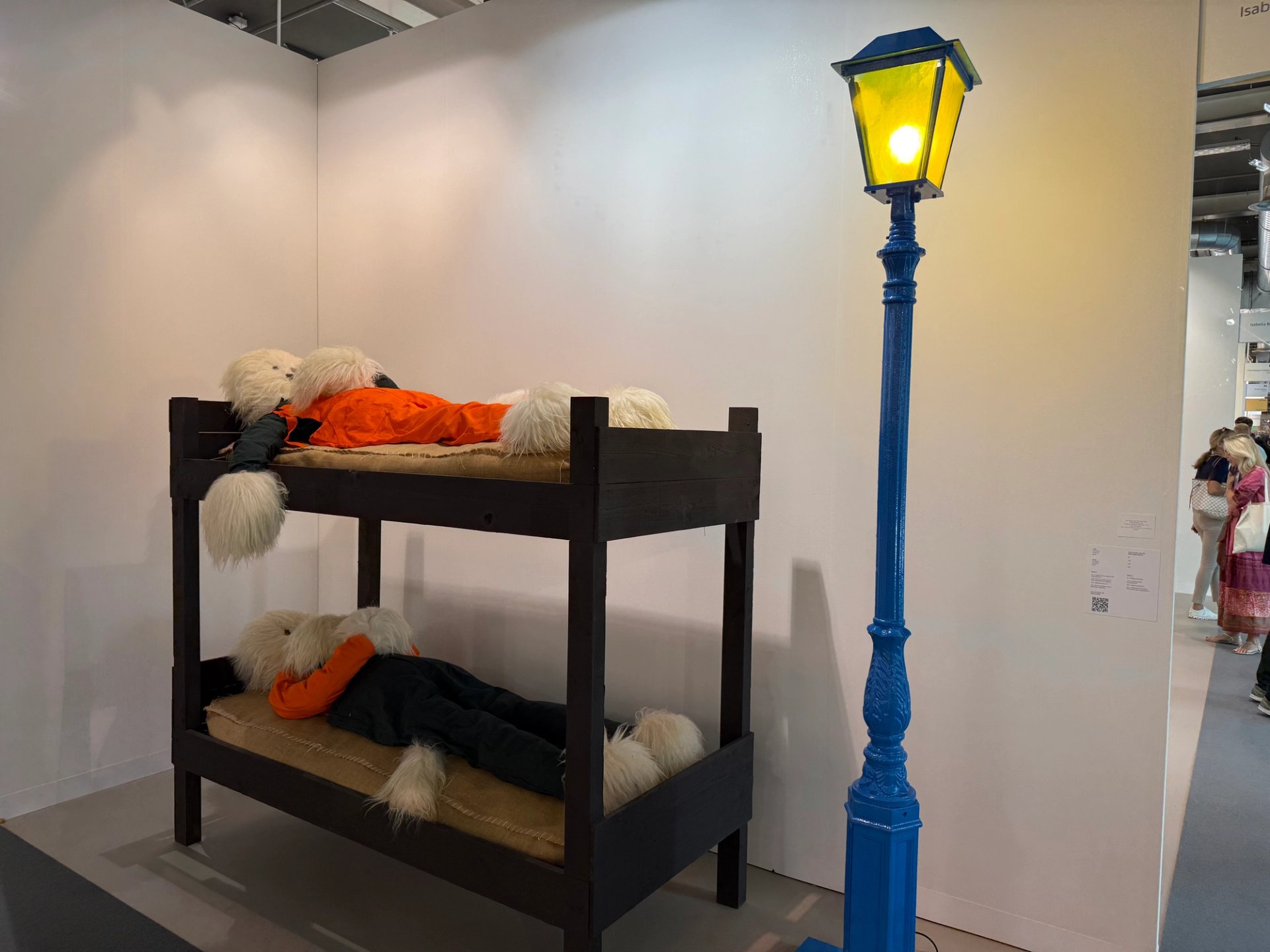 A pair of puppets sleeping on a makeshift bunk bed are a talking point at Art Basel, with multiple mystified fairgoers stopping to peruse the bizarre pair of fluffy beings on show at Galerie Isabella Bortolozzi. The shaggy duo, Kwik & Kwak (2024), asleep against the light of a cast-iron lantern, are the creation of the Belgian duo Jos de Gruyter & Harald Thys, who unveiled the woolly beasts in a 2004 performance in the project space Etablissement d’en face in Brussels. The puppets have lived on and even have their own daily routines outlined on an accompanying wall text. Kwik (50) and Kwak (40) should be fed, for instance, cereals with apples at 9am and German biscuits at 2pm (chicken with chocopasta is another tasty option).