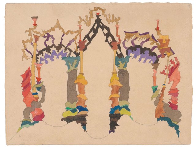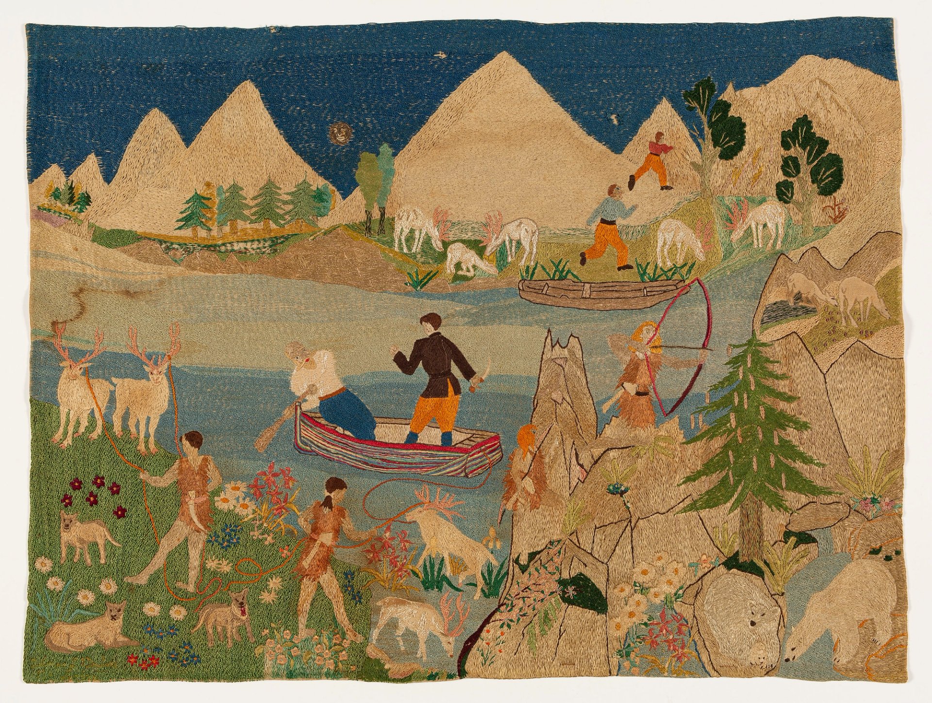 Marguerite Sirvins’s Landscape with Boats, Hunters, and Animals (around 1944–55) Courtesy of Lille Métropole Musée d’art Moderne, d’Art Contemporain et d’Art Brut