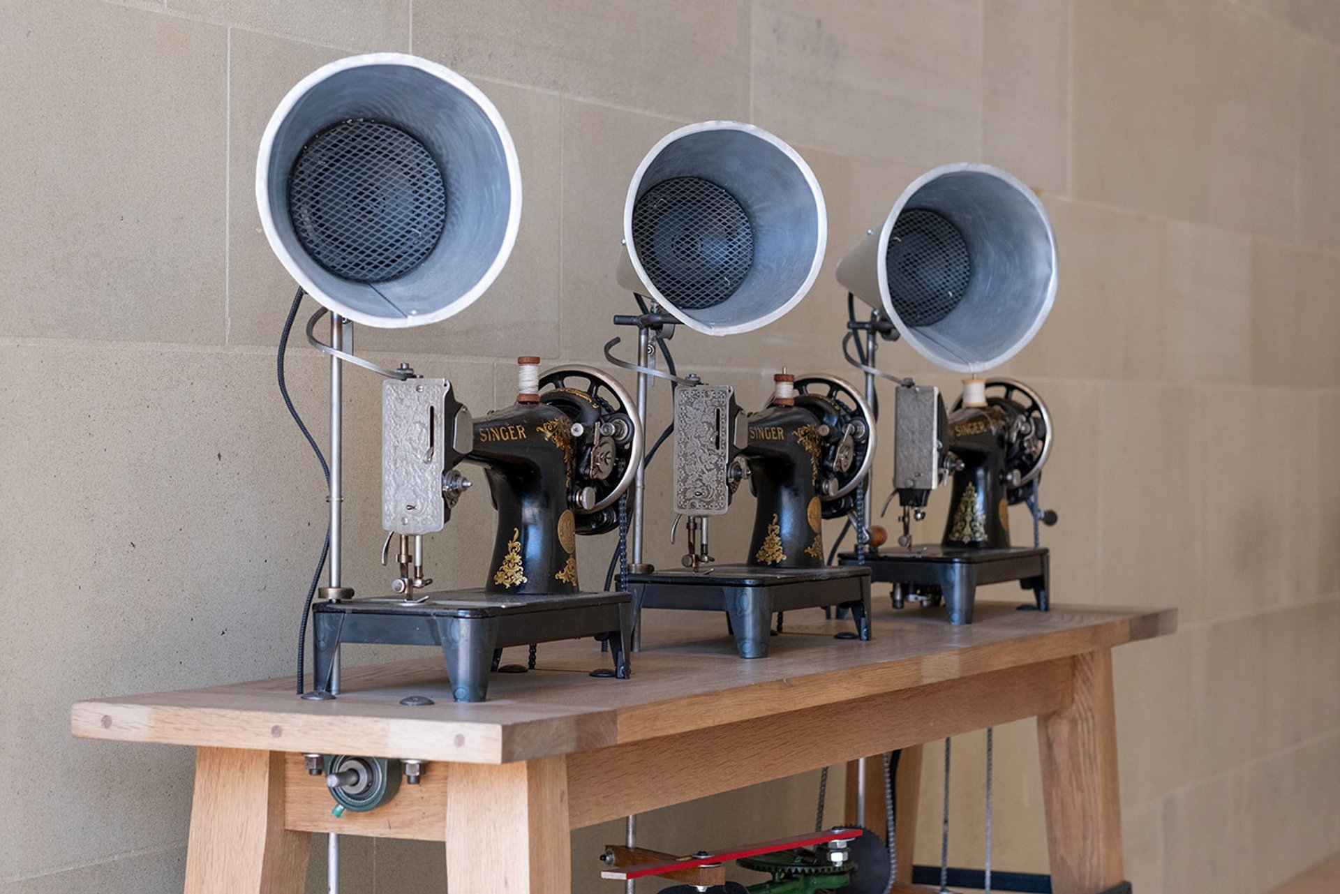 The exhibition duly starts with kinetic and mechanised pieces used in live performance: megaphones and an upturned bicycle wheel on legs with casters; flapping timber arms set in motion via cogs and chains; the 2019 piece "Singer Trio" which features three Singer sewing machines equipped with speaker cones that emit recorded song.