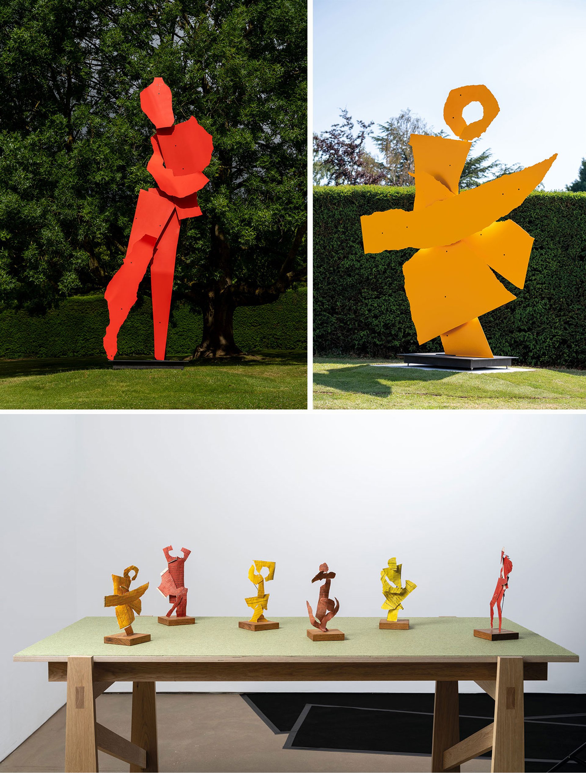 Most exciting are the six even bigger pieces, Paper Procession I to VI (2024) of which, from this elevated vantage point, you see just their coloured heads peeking out over the flat, grassy roof of the gallery. They are installed along the towering hedge that borders the gallery's lawn, the tallest 5.2 metres tall, the shortest, 4 metres: so many figures in various freeze-framed movements. One, bright yellow, holds its arms over its head, another in red cradles something round to its chest, its right leg stretched back in a gentle arabesque.
