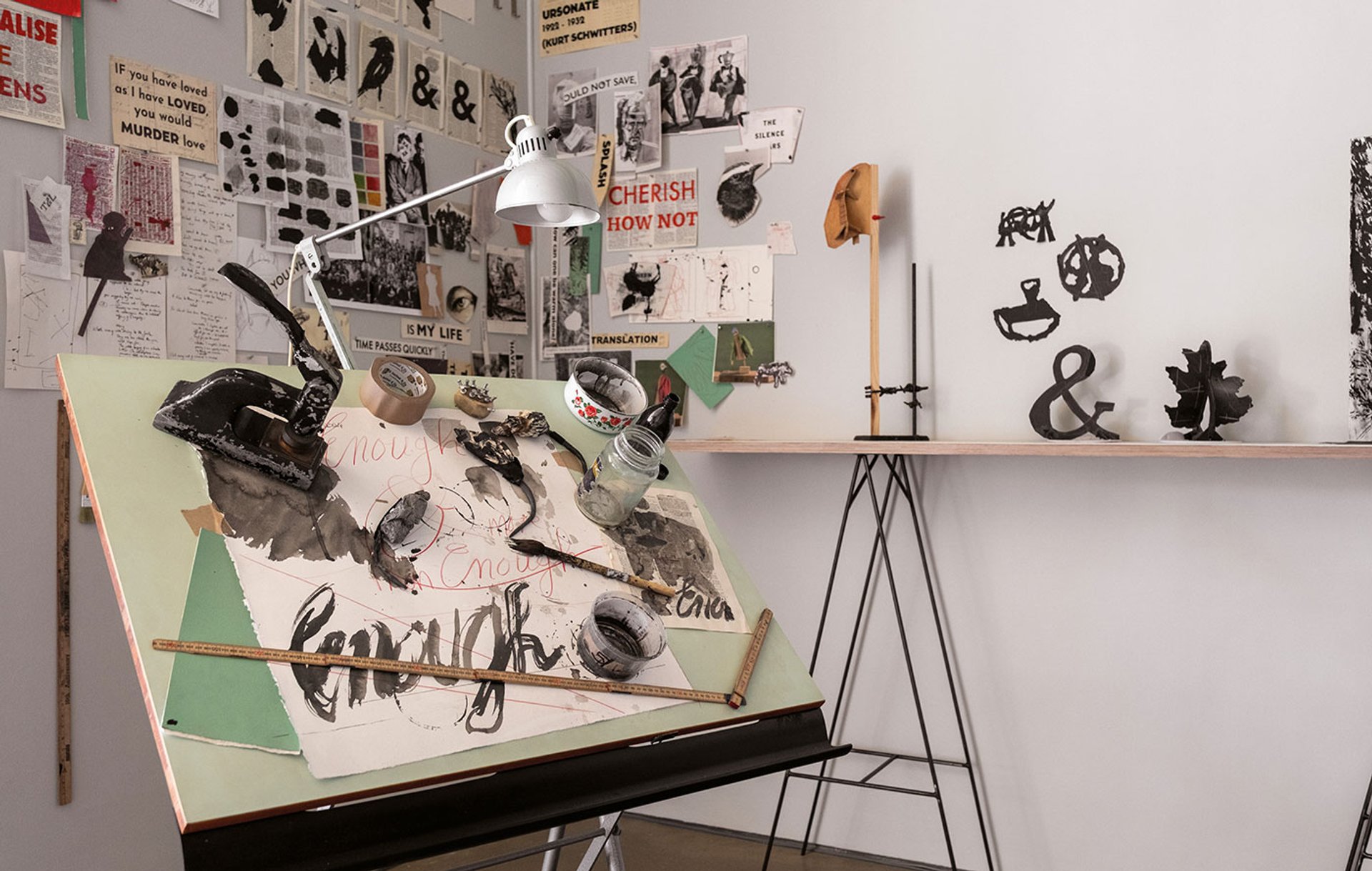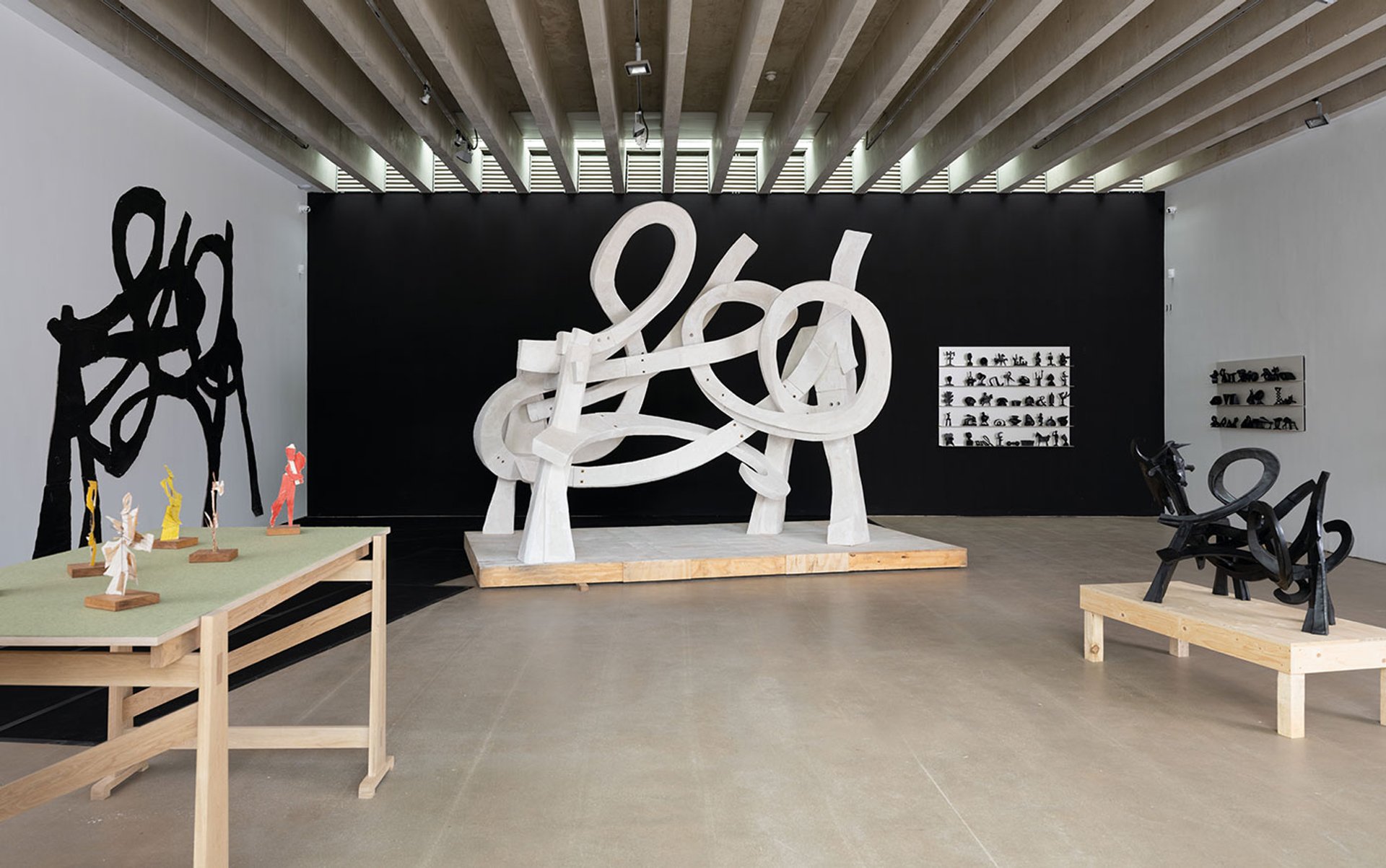 A second room, which Kentridge describes as "the most sculptural", is organised around four sets of what he terms "Glyphs": pieces that start as tiny torn-paper silhouettes (depicting things like a bit of barbed wire, a toy rattle, an ampersand, a marching figure) that are then given bodily shape as tiny bronzes. When exhibited as sets, they immediately reveal how they function as symbols or words, their order as infinitely variable as letters composing sentences. These are then made incrementally bigger, the artist testing out the limits of where a thing might go.