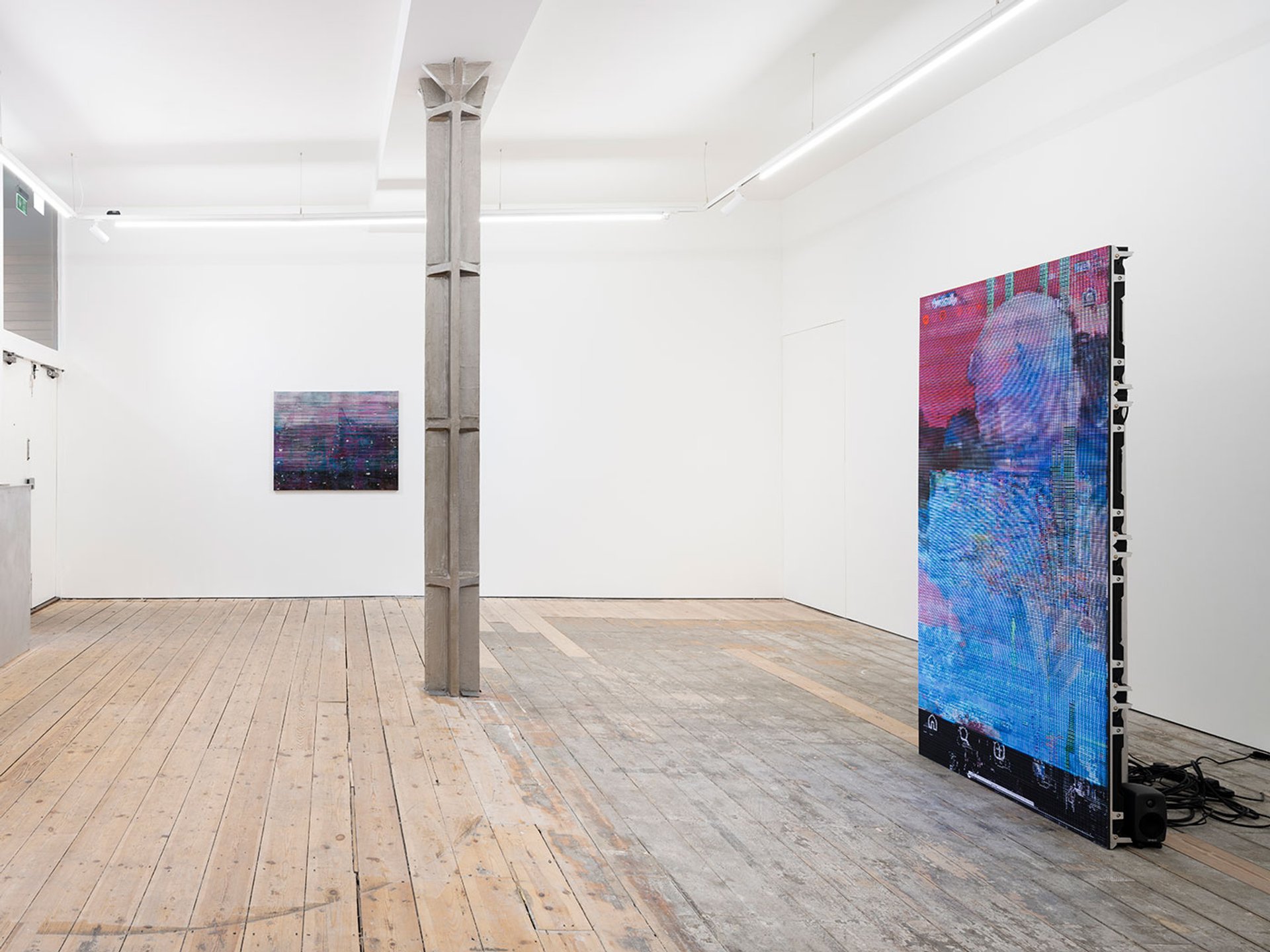 Of course, that lens is also financialised, politicised, and militarised, which has prompted the German media artist and film-maker Hito Steyerl to ask, with the release of her new book Medium Hot: Images in the Age of Heat(2025): “In an age where most images have become operational, […] what can an inoperative image be?” With machine learning now being used to enhance the precision and autonomy of drone operations, artists are helping to maintain public focus on the opaque domain of nonhuman vision. For the Montreal-born New York-based artist Chris Dorland, “Art can’t necessarily stop the machinery, but it can expose its limits [...] Technical error becomes a rupture in the smooth interface — a break in the fantasy.” The title of his recent exhibition at Nicoletti Contemporary, Clone Repo (server ruin), refers to the practice of downloading files stored online to a local hard drive. Bathed in the glow of its central LED monolith displaying degraded screen grabs from Tik Tok and Instagram against a “dead server sound bath” by Leon Louder, the show appeals to the urge to evade systems of surveillance. It also relocates glitch aesthetics from the screen to a new series of paintings, subverting one form of seduction after another while validating multimedia practice.