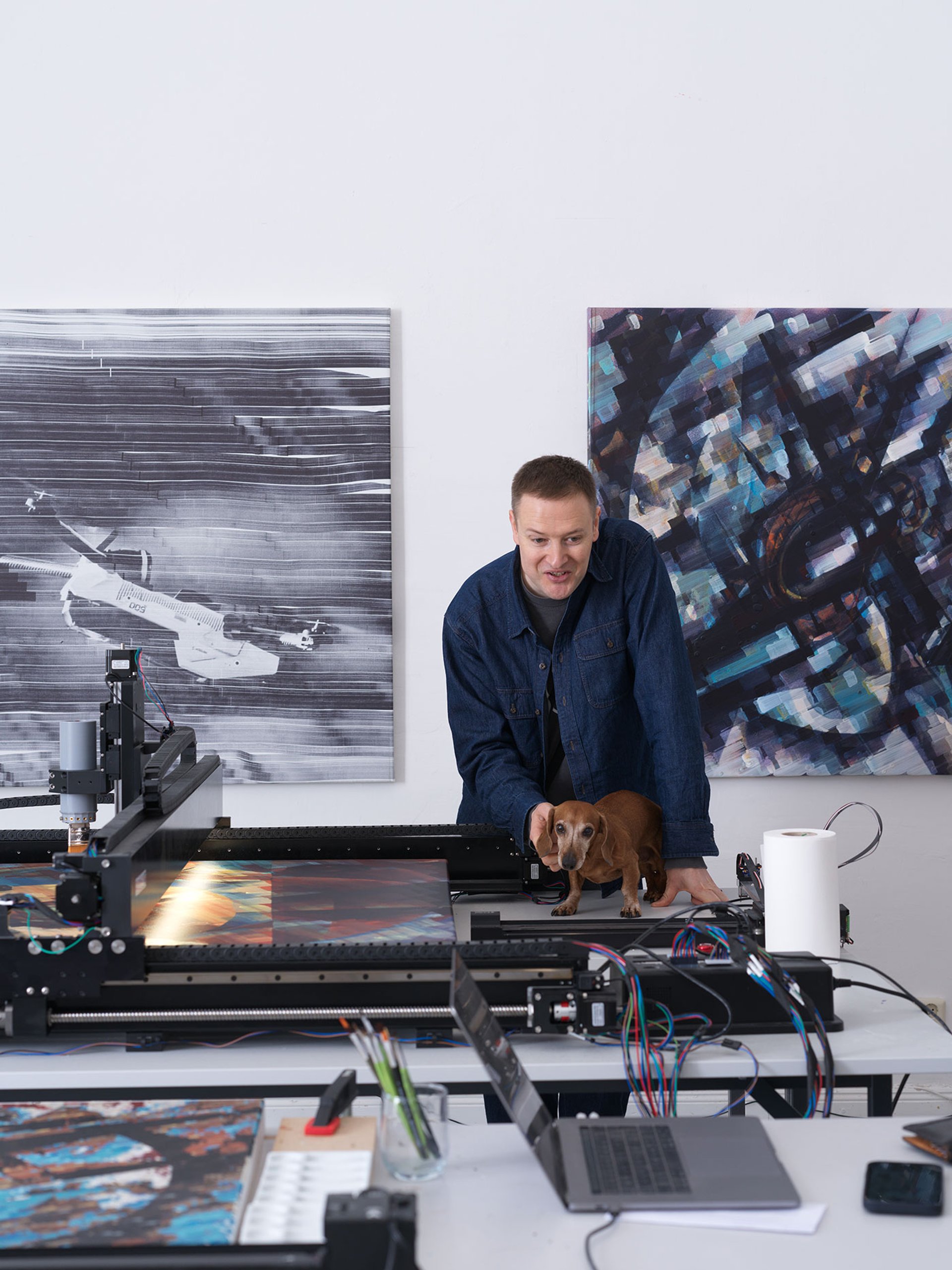"There is no such thing as offline and online, we’re always both." The artist Simon Denny working in his studio with a plotter painting machine, 2025 Courtesy of the artist, Petzel Gallery, and Kraupa-Tuskany Zeidler. Photograph: Nick Ash