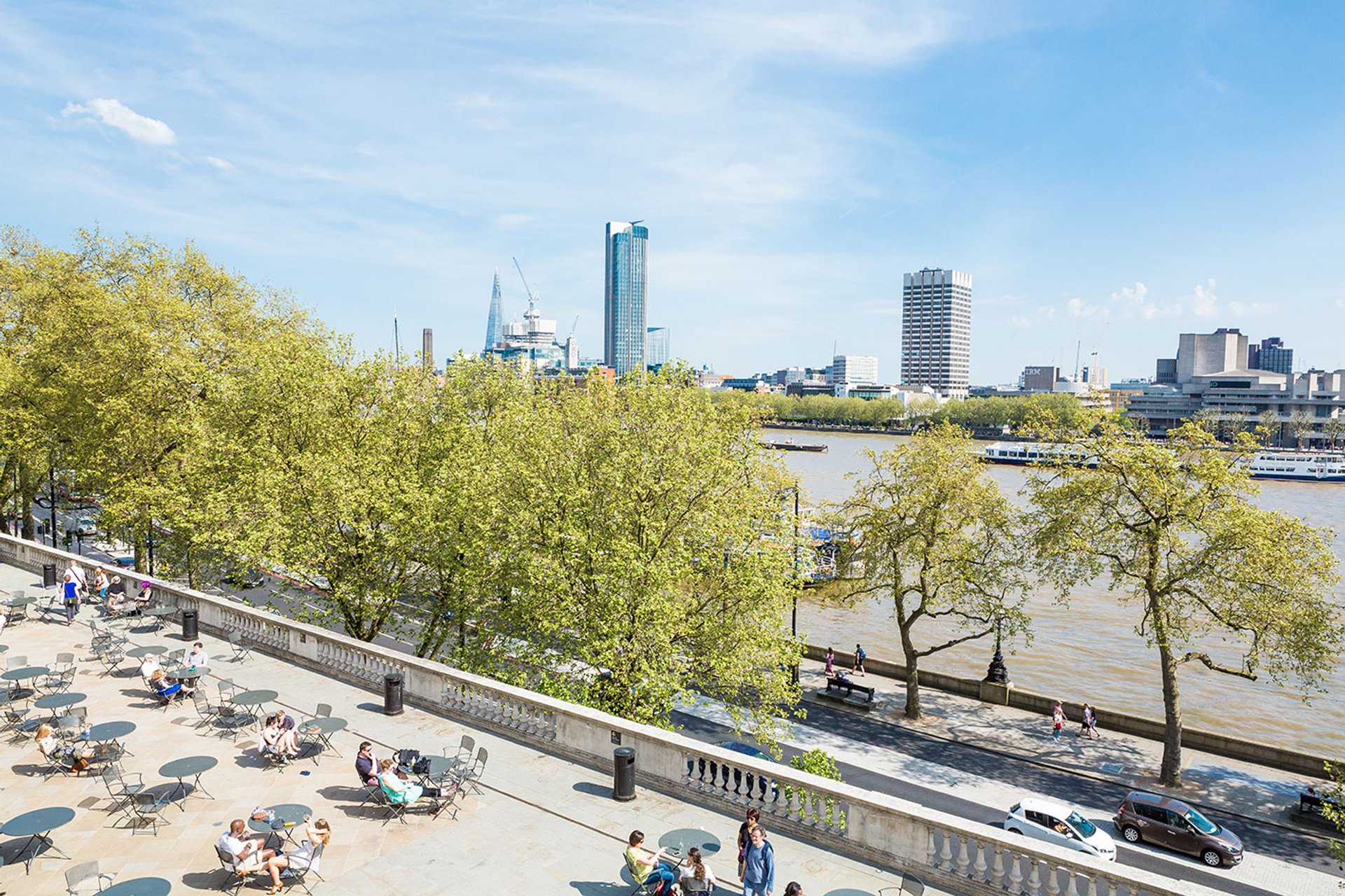 From the great Thameside terrace, visitors can take in points of view close to those captured in two 1750-51 canvases by Canaletto (now in the Royal Collection) towards the City of London (with St Paul’s the main feature 275 years ago) and towards Westminster (when Westminster Abbey still dominated the skyline in Canaletto's day). Visitors can also now enter the building from the Thames embankment (completed in 1870) and come up by stairs or lift to the courtyard—with cafés and public seating.