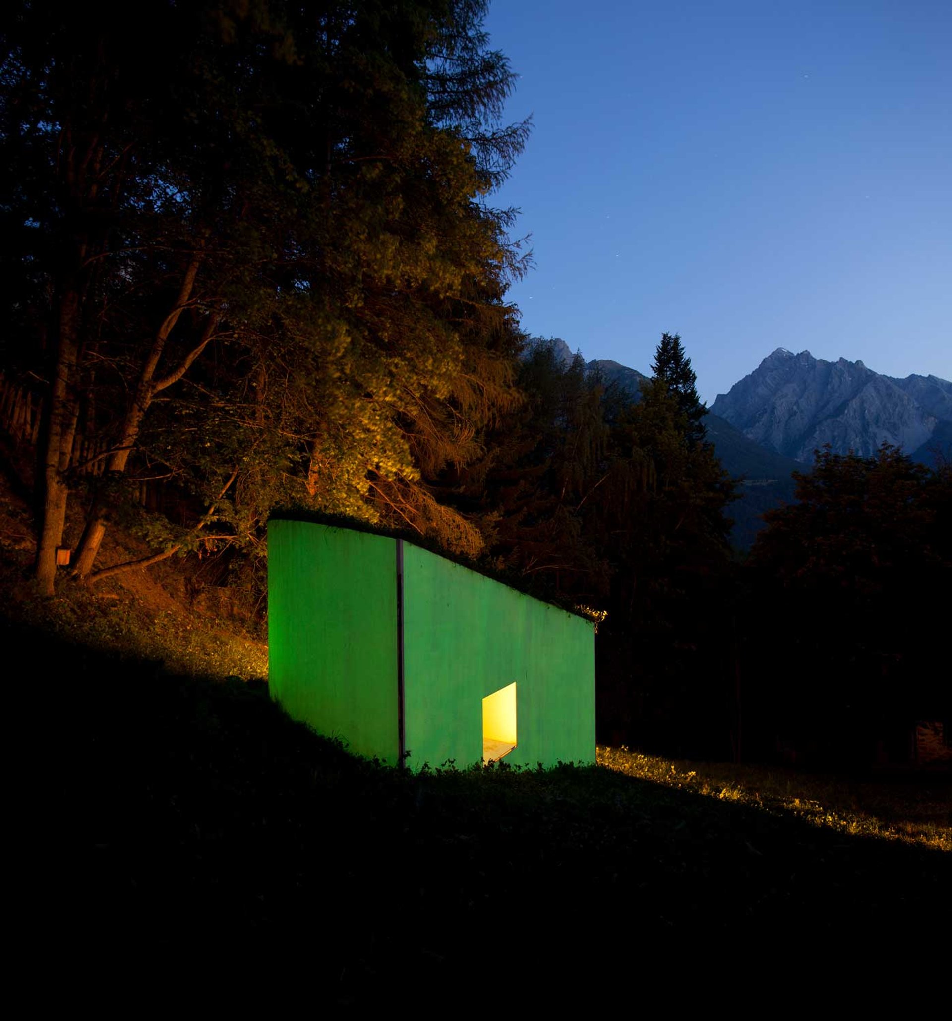 Parkin Sent is home to several outdoor installations by Vital that encourage visitors to explore the forests and rugged terrain, engaging with nature as they search for each artwork. Open seasonally (Fridays from mid-June to early October), the park includes Punt dals asens (Donkey Bridge) (2001), an installation of aluminium donkey heads on narrow vertical beams, the heads getting higher off the ground as the land below slopes downward. Brave visitors can walk along the pathway while holding rails on either side of them. Playing with perception is another bridge, simply called Bridge (2008), which is inconspicuous and vanishes into the forest, its stainless steel surfaces reflecting the surrounding environment. While the bridge only appears to be invisible, JOSÜJO (Disappearing House) (2007) takes a more literal approach. Resembling a triangle with a grass-covered roof, the structure descends into the ground at the push of a button.