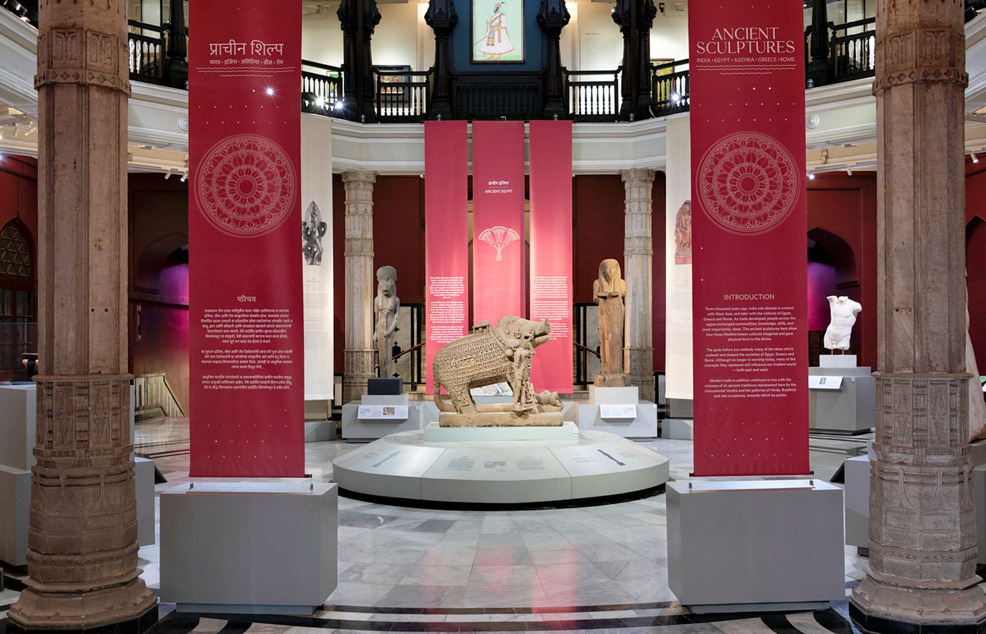 An installation view of Ancient Sculpture of India, Egypt, Assyria, Greece and Rome (2024) at CSMVS. The Mumbai institution created the mobile museums project in collaboration with the exhibition, which was co-curated with J. Paul Getty Museum in Los Angeles, the Berlin State Museums and the British Museum in London Courtesy: CSMVS