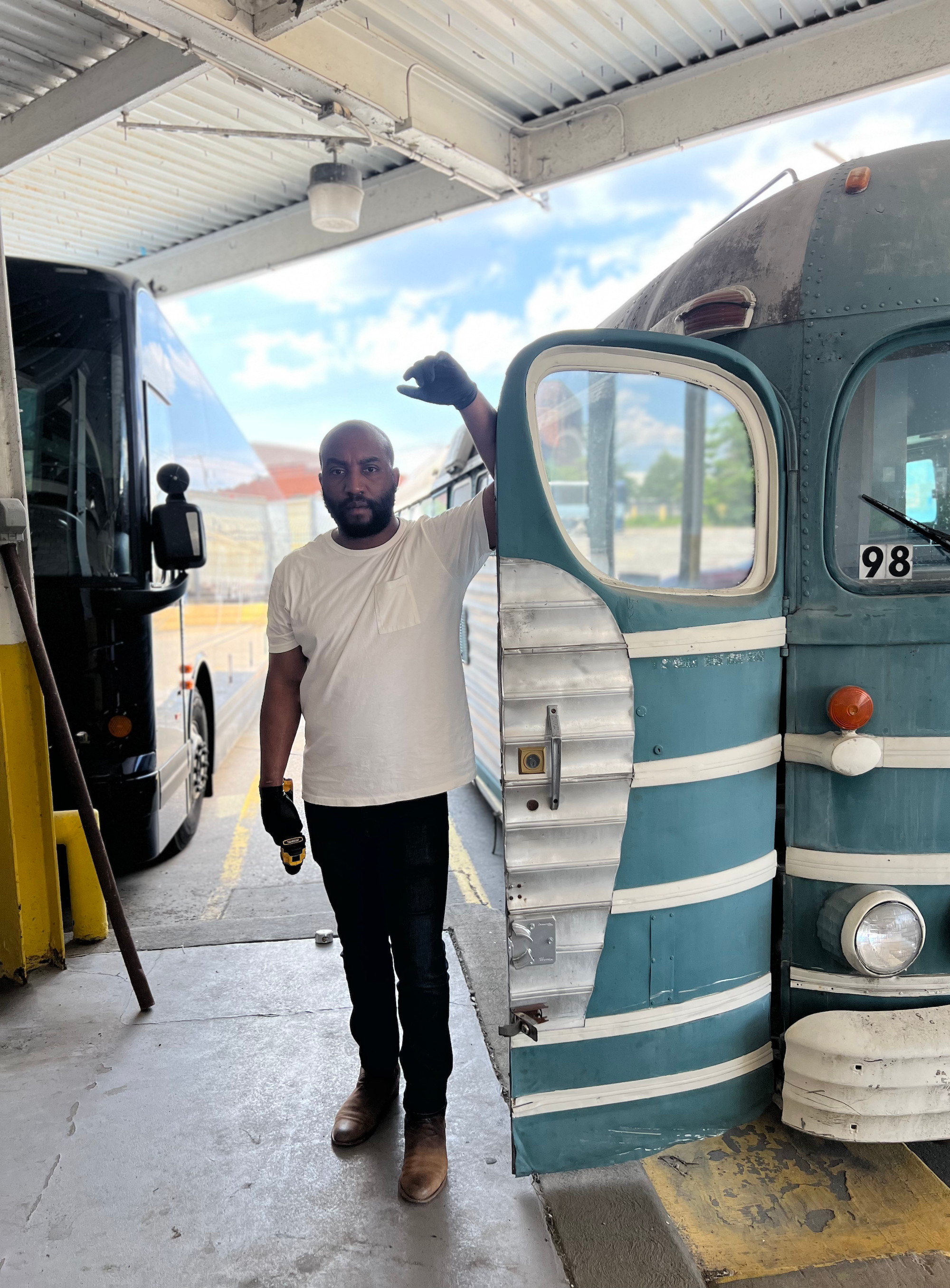 In 2022, Edwards started wondering whether any bus used during the Great Migration survived, for him to restore and share its story. His thinking was along the lines of: “Hey, that’s a crazy idea, I should probably pursue that,” he says. When a suitable antique surfaced in Pennsylvania, priced at $12,000, he bargained the junkyard owner down to $5,500 in cash. (Shipping the vehicle by flatbed truck to Cleveland, with a pitstop at Cindy Rollins’s driveway in Virginia, cost $7,000.) Many original bus components survived the 1970s redo, including the back bench used by Black riders and the destination sign over the windshield made of a roll of black-and-white fabric.