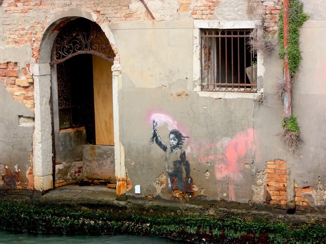 Migrant Child, which shows a child holding a flare in her hand and wearing a life vest, was sprayed onto a wall of the Palazzo San Pantalon, a lavish three-story residence on a canal in Venice’s sleepy Santa Croce district, in 2019. Positioned just above the canal’s waterline, it is one of only two artworks in Italy officially attributed to Banksy.