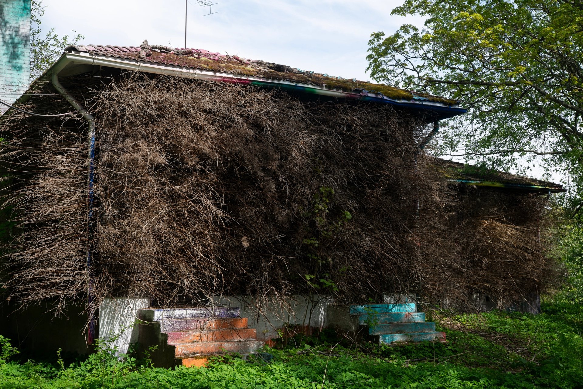 Back on Vallisaari, the Finnish artist collective nabbteeri have created a suitable host, made from fallen branches, dead perennials and other locally gathered plants which cover the exterior of the island’s dilapidated schoolhouse. Clinging to a building formerly occupied by the children of soldiers, this twiggy, leafy foraged melange evokes camouflage and self defence. It also includes some of the plant species—such as Turkish warty-cabbage and hoary alyssum—which were accidentally introduced to the island as human-imported fodder. Now, whether indigenous or alien, they all combine to form a multispecies shelter for the island’s diverse cohabitors.