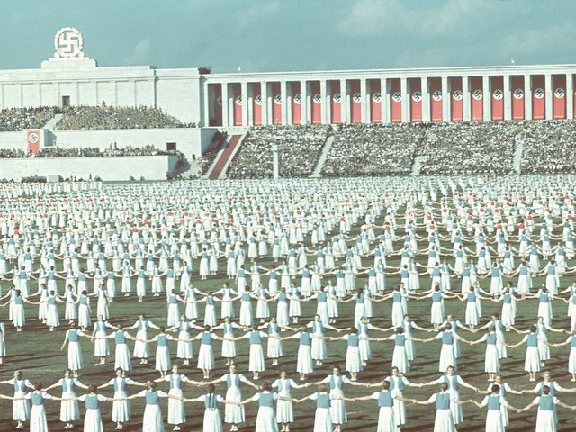 While she made a one-hour film of that rally, a Nazi rally in 1934 was the subject of Triumph of the Will, her first masterpiece. From the beginning she played into the mythology of power, showing a plane soaring through billowing clouds and then landing, Hitler emerging from it like a saviour descended from the heavens. Later, the film cuts between rousing speeches, ecstatic faces and the spectacle of thousands gathered in Albert Speer’s monumental rally grounds.