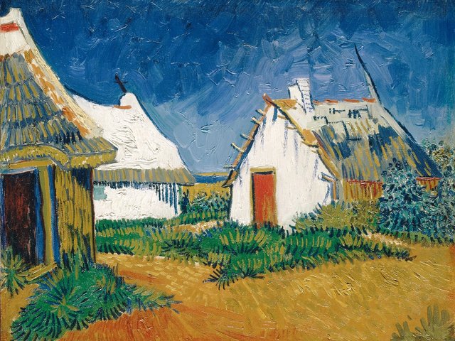 Most of the composition is taken up with the bare field, with the soil made up of short orange and blue brushstrokes. These are complementary colours, giving a powerful vibrant effect.