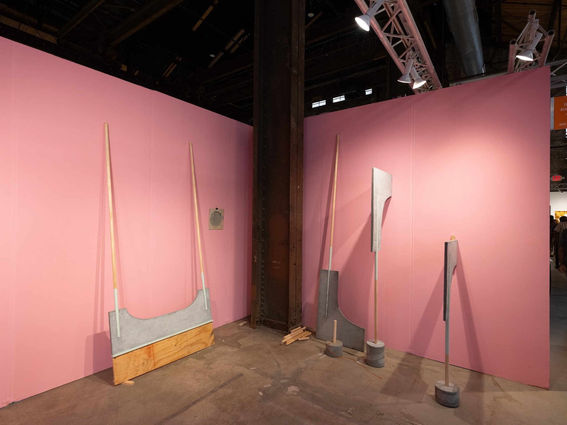 Another standout at the fair was Third Ear, Second Skin, an exhibition of sculptures organised by Melissa Messina, this year’s guest curator, featuring works by Krista Clark, Sonya Yong James and Vadis Turner. Clark’s work, with its mix of heavy concrete elements and delicate wooden rods, acted as a commentary on labour and construction, particularly unfinished or in-progress construction.