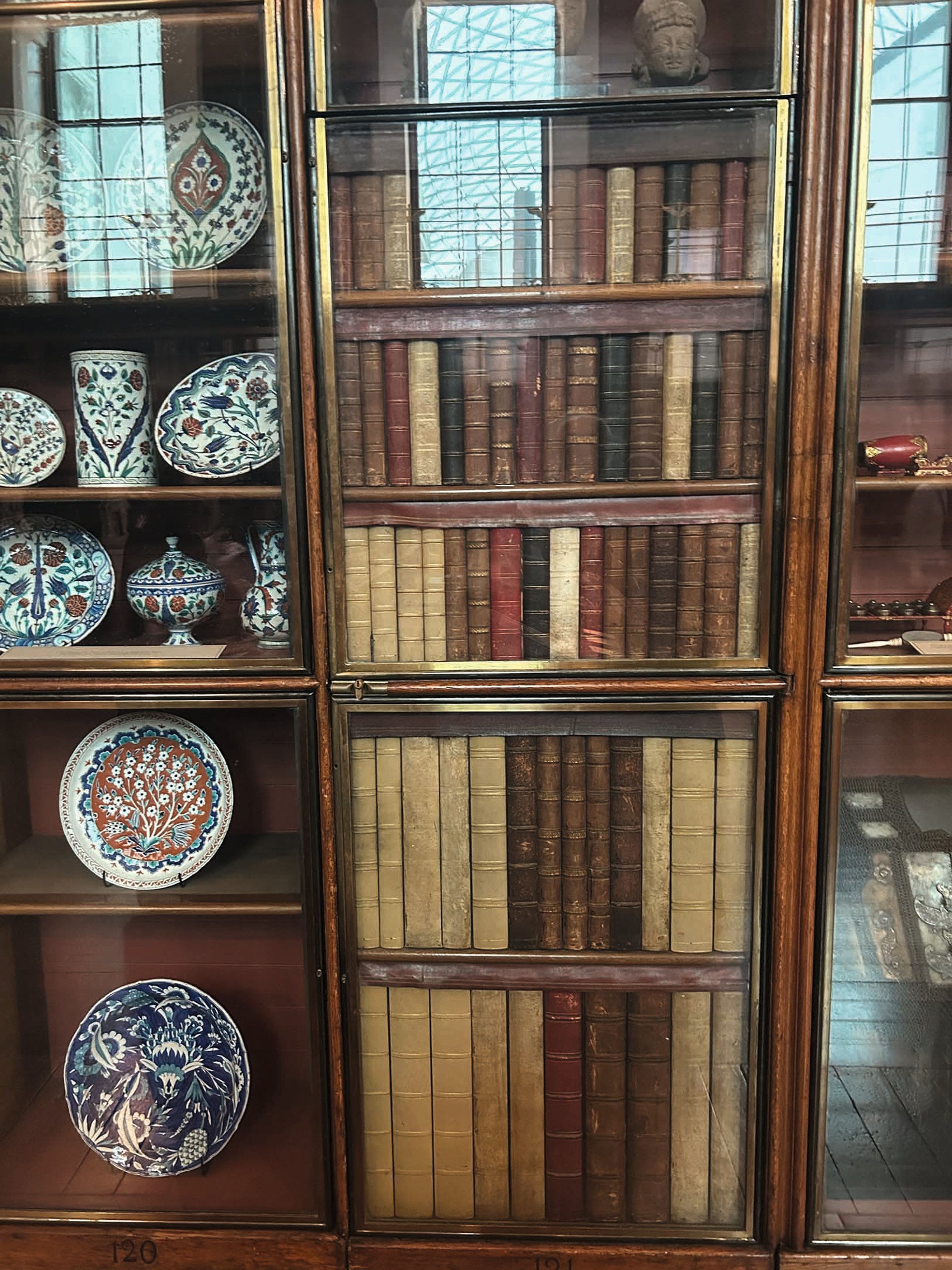 Behind a “bookcase” in the Enlightenment Gallery is a hidden door, which in the 1850s led to the office of the director, Anthony Panizzi. He had fled from Italy in 1822 and was then condemned to death in absentia on subversion charges and membership of a secret revolutionary movement, the Carbonari. In London he worked at the British Museum, rising to become director. At the museum he needed somewhere to hide, since he feared he might be pursued by the Italian authorities. The glass-covered door, with its fake book spines, is still there (in the north-east corner of the room), although few visitors notice it. It remains in working order, provided you have the key. Panizzi’s other architectural innovation was to sketch the design for the Round Reading Room.