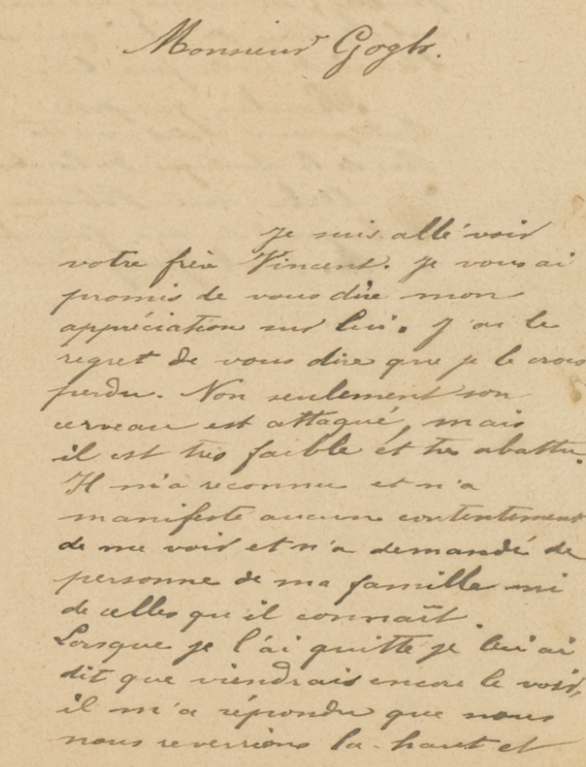 Fortunately Van Gogh’s wound healed quickly and on 3 January Roulin telegraphed with the good news that he had “entirely recovered”. The originals of the ten letters sent by Roulin to Vincent's family are being shown for the first time in the Amsterdam exhibition.