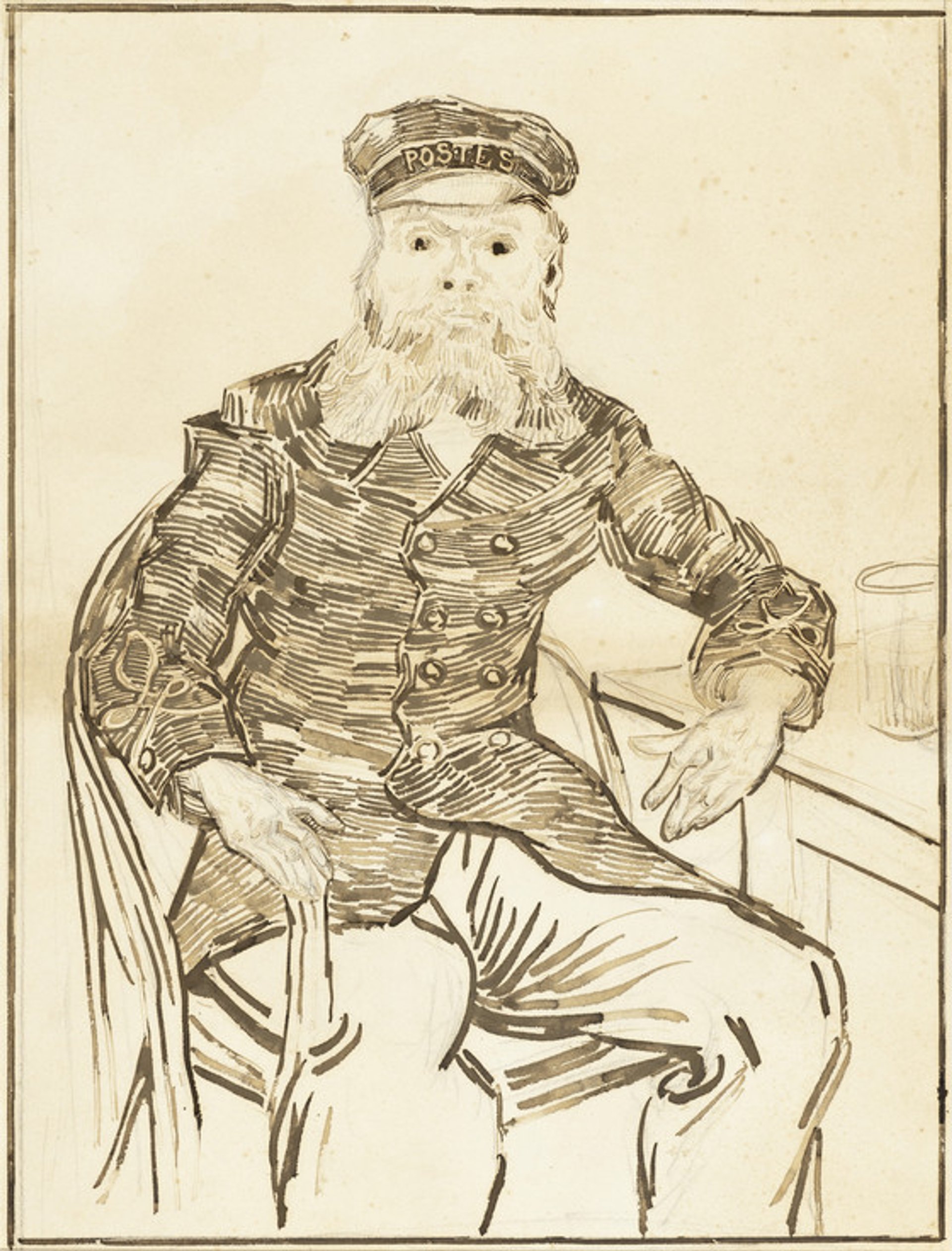 In a drawing made after the painting, Van Gogh included a glass (as in the Hals), resting just beside the sitter. Although it was drawn to inform his brother Theo about the work, Vincent omitted the glass in the painting. Perhaps in the drawing for Theo he was simply emphasising the postman’s love of drink.