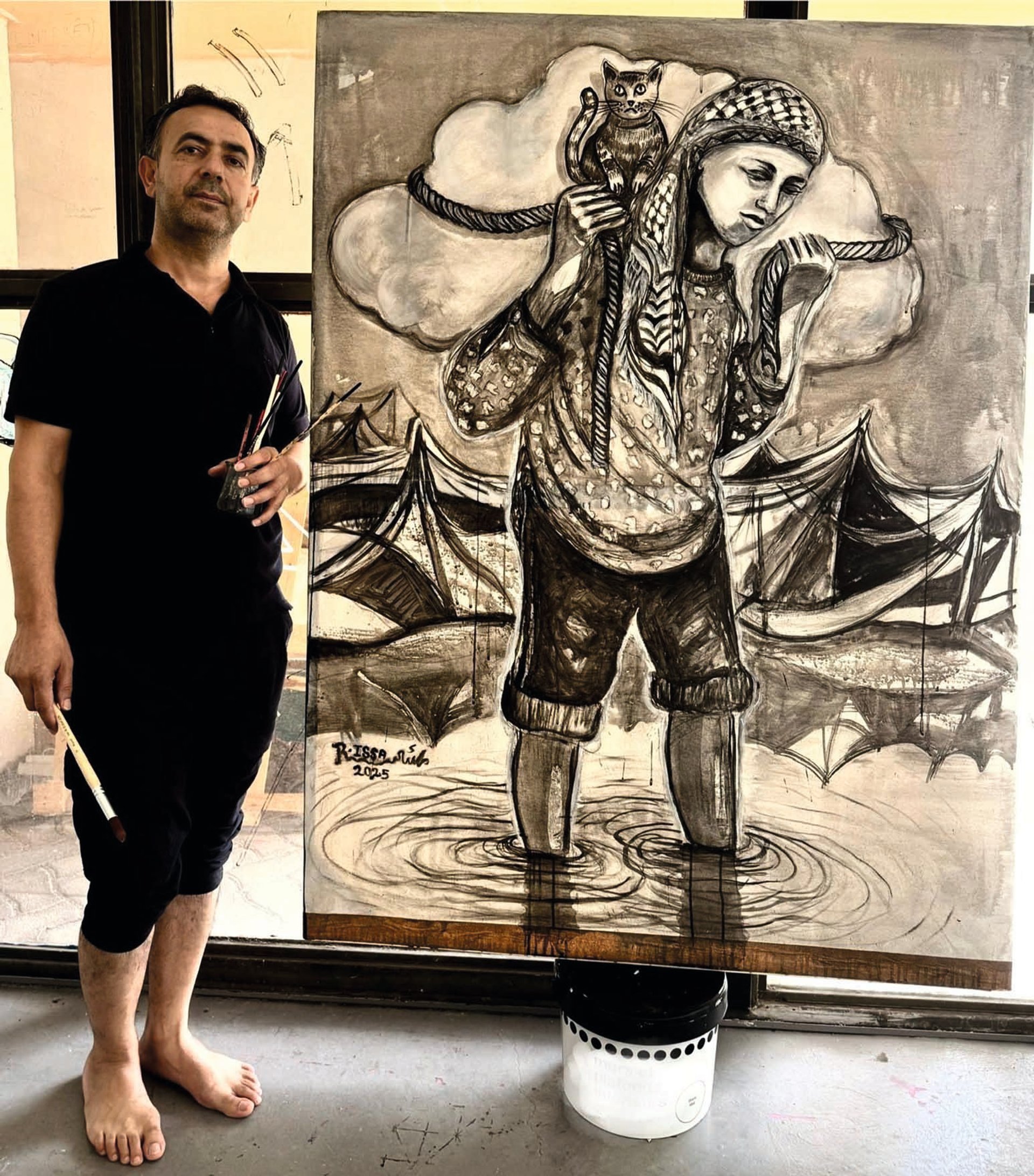 The couple’s close friend and Eltiqa co-founder, Raed Issa, left Gaza in April 2025 thanks to a French art scholarship that secured his exit with the help of the French embassy. “We are outside of the hell,” Issa tells The Art Newspaper from France. In 2024, he tried to leave for Egypt, but while his wife and children were granted visas, he was denied. He convinced his family to leave to without him, promising to follow, but, soon after, Israeli forces closed the Philadelphi Corridor on Gaza’s border with Egypt, leaving him trapped.