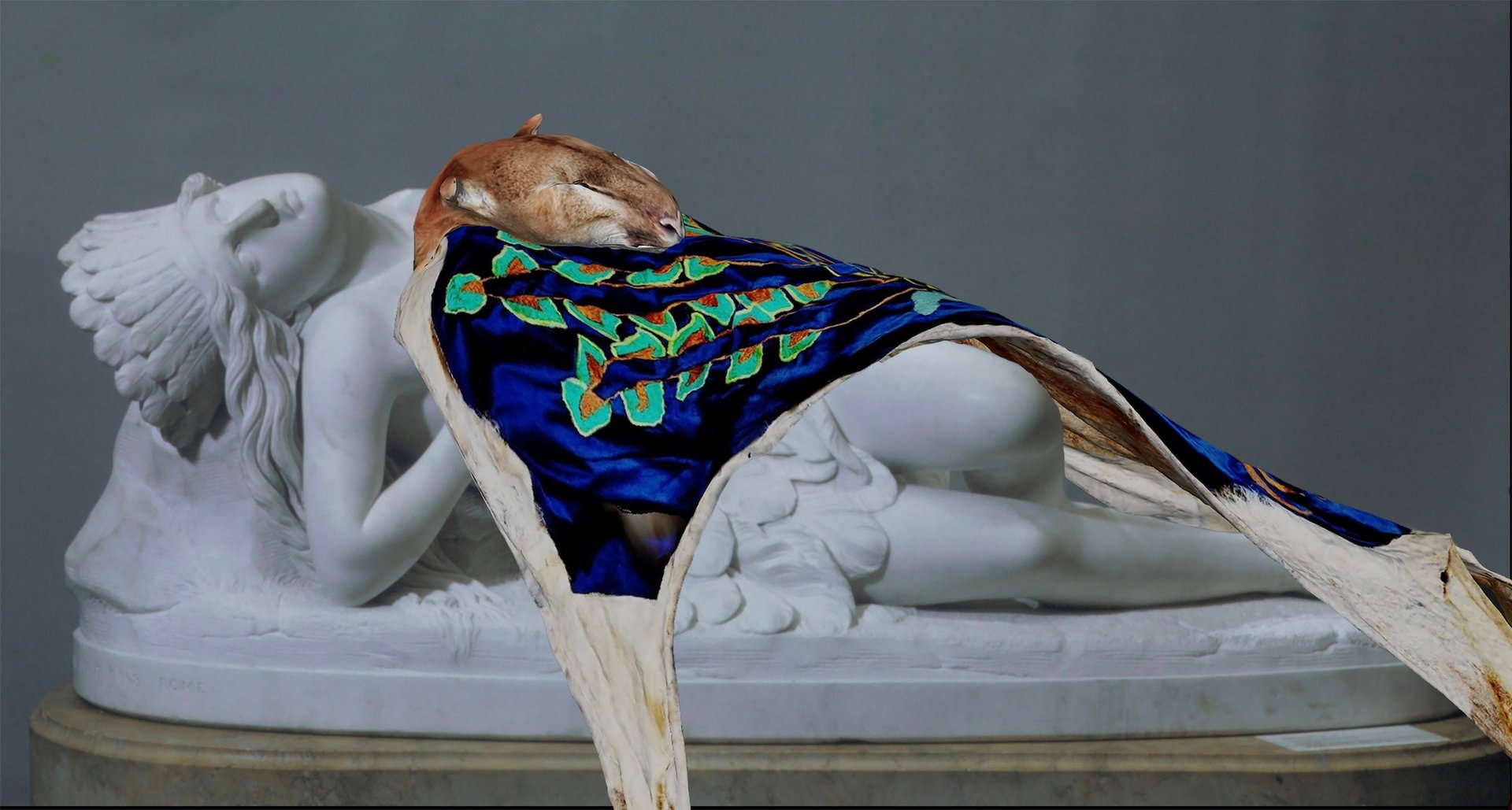 Priscilla Dobler Dzul's Future Cosmologies: The Regeneration of Maya Mythologies (2023) digitally overlaid on Thomas Crawford's Mexican Girl Dying (1846, carved 1848) at the Metropolitan Museum of Art Courtesy the artist and Amplifier