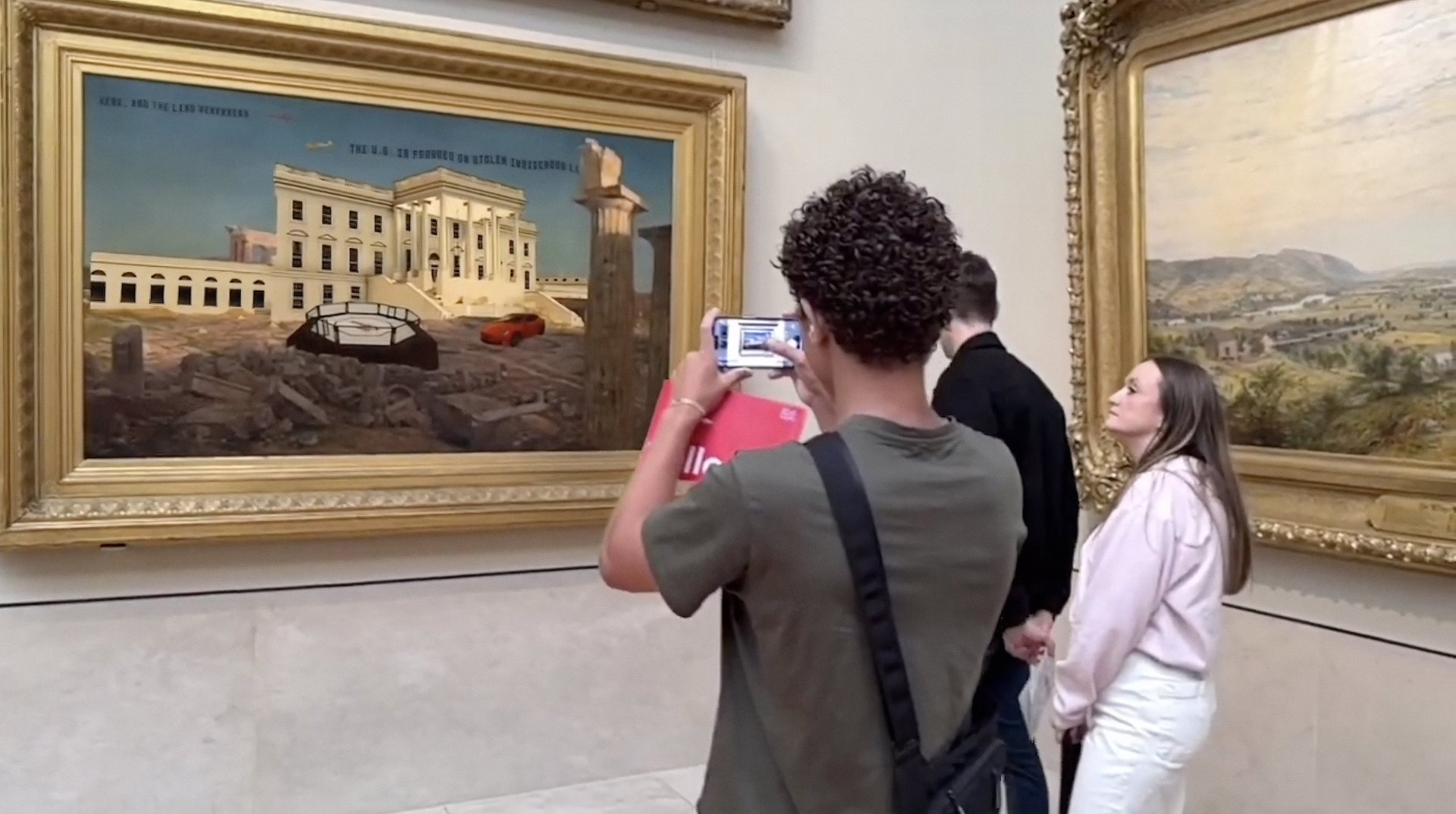 Jeremy Dennis's The White House (2025) digitally overlaid on Frederic Edwin Church's The Parthenon (1871) at the Metropolitan Museum of Art Courtesy the artist and Amplifier