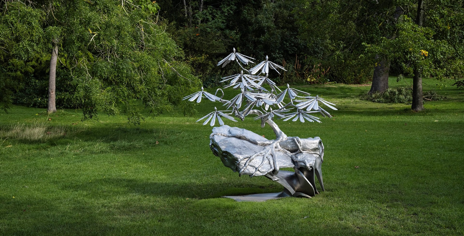 Timur’s work is a hyper-real depiction of a wild rhododendron species that can’t be cultivated by humans. From a distance, it might look like a real plant, but when you approach it you realise it’s aluminium. That illusion, that play of shadow and surface, speaks directly to the theme. He is part of a younger generation of artists working with new materialism, where the question is not only what an object represents, but how it embodies relationships between human and non-human. His sculpture stands as a double: at once wild and artificial, fragile and enduring, free yet fabricated.