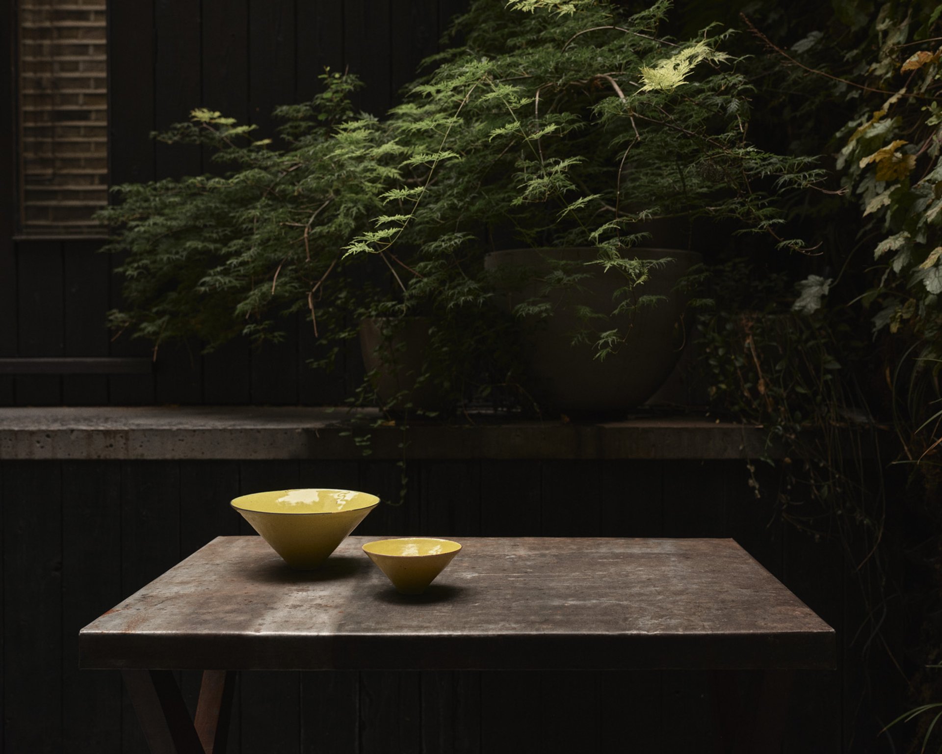 Conical bowls (around 2005) by Emmanuel Cooper sit on Pierre Jeanneret’s Working Table (1960) Photo by Rich Stapleton; courtesy of Rajan Bijlani