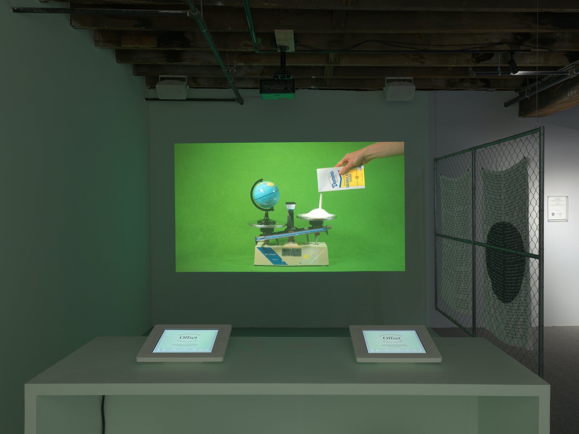 Installation view of Tega Brain and Sam Lavigne: How To Get To Zero at Pioneer Works featuring Tega Brain and Sam Lavigne, Offset, 2023-25 Courtesy of the artists and Pioneer Works. Photo by Dan Bradica Studio.