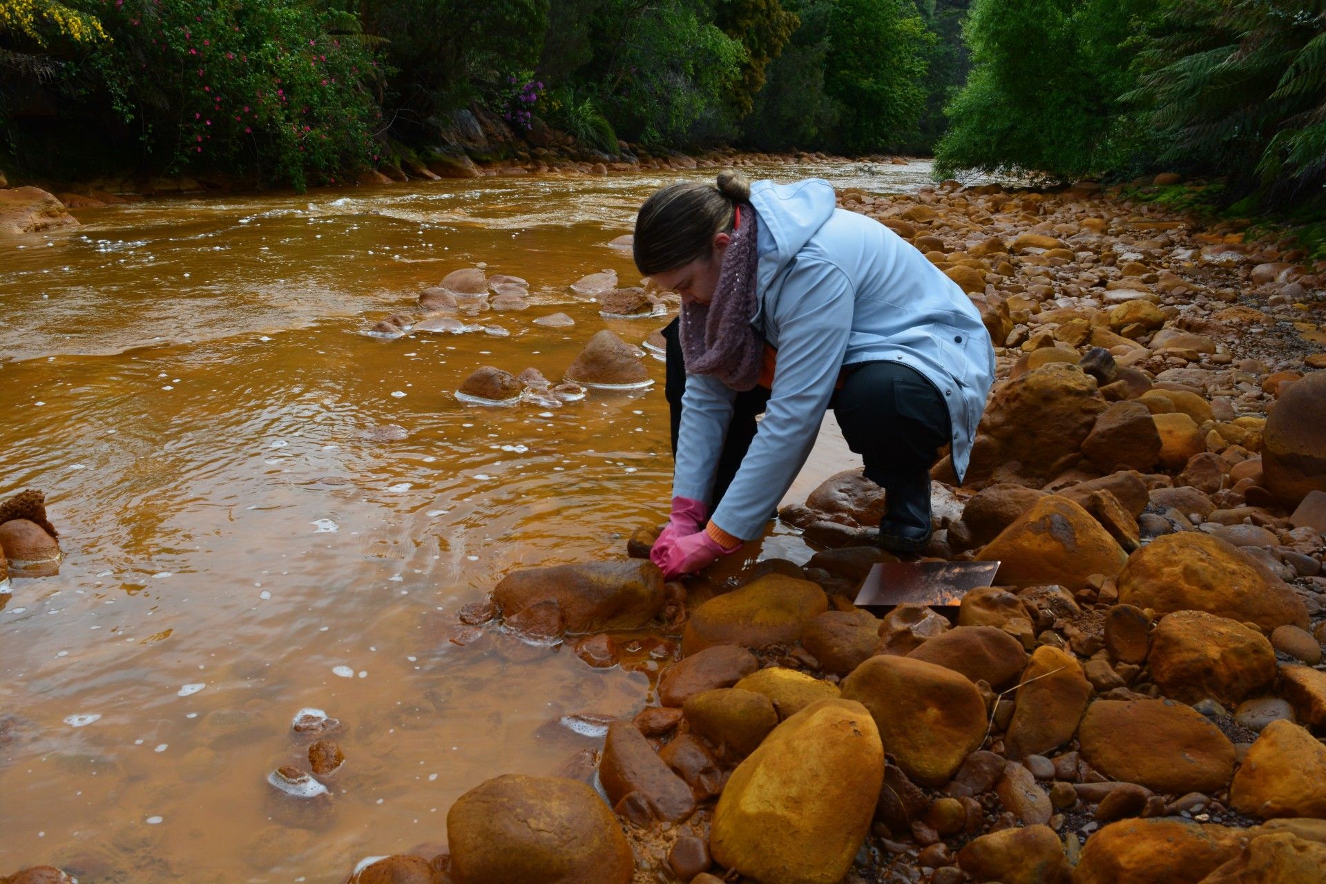 The artist Bridget Baskerville, for example, is drawing on the qualities of a nearby landmark known as the confluence to create something new. The site, down a steep rainforest path, is a place where the tannin-stained King River collides with the burnt amber flow of the Queen River. The water there is incredibly acidic—and Baskerville has used it to etch copper plates, which will form part of Overflow, a site-specific kinetic sculpture that will be installed in the town.