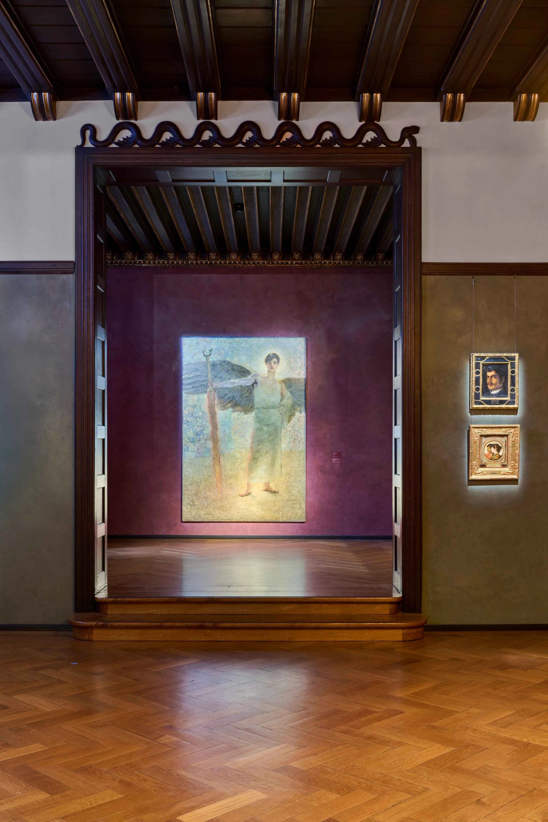 An installation view of Villa Stuck’s rehang, showing Franz von Stuck’s The Guardian of Paradise (1889)