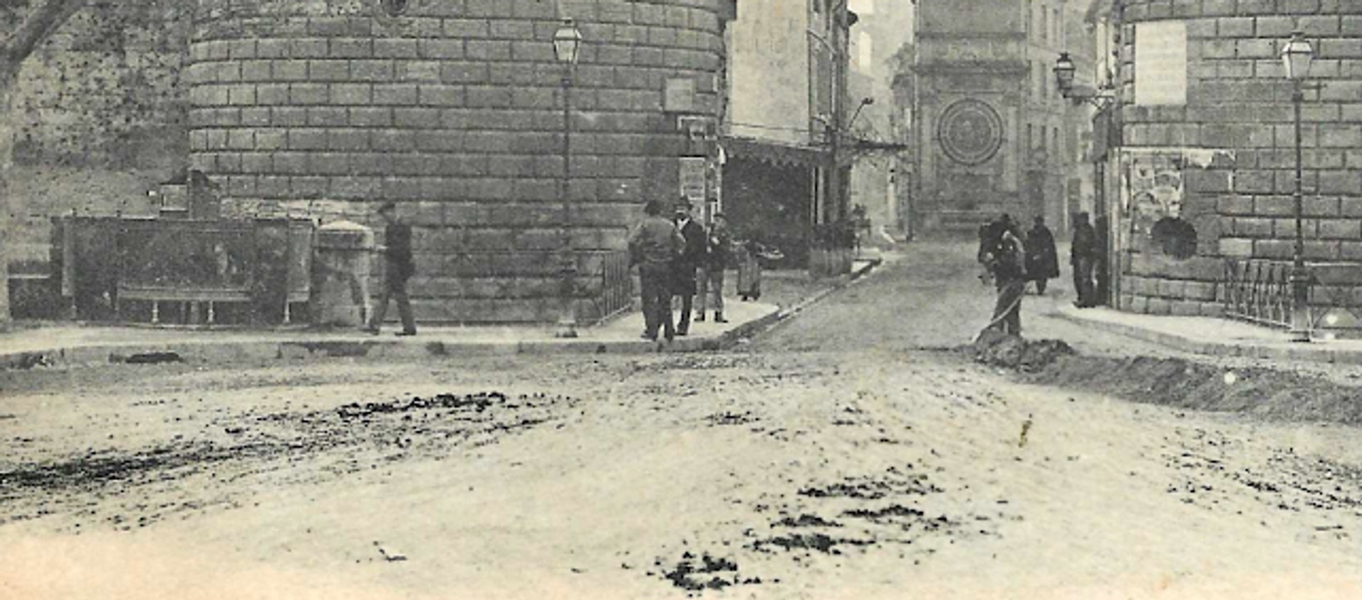 He points to a 1902 postcard which shows the south side of Place Lamartine (the Yellow House was on the north side). In the postcard, there is a similar pile, parallel to the edge of the road, with a man holding a shovel just visible at the far end. He is clearing up manure that has been dropped in front of one of the main rampart entrances to the city, on the route from the railway station.